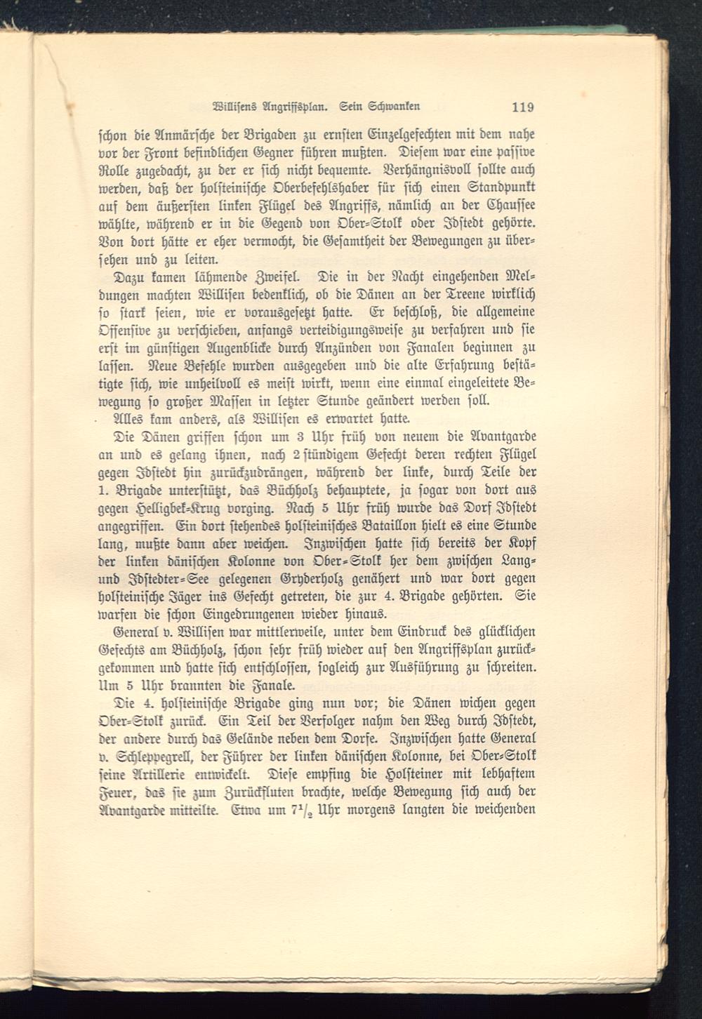 schon die Anmärsche der Brigaden zu ernsten Einzelgefechten mit dem nahevor der Front befindlichen Gegner führen mußten. Diesem war eine passiveRolle zugedacht, zu der er sich nicht bequemte. Verhängnisvoll sollte auchwerden, daß der holsteinische Oberbefehlshaber für sich einen Standpunktauf dem äußersten linken Flügel des Angriffs, nämlich an der Chausseewählte, während er in die Gegend von Ober-Stolk oder Jdstedt gehörte.Von dort hätte er eher vermocht, die Gesamtheit der Bewegungen zu über-sehen und zu leiten.