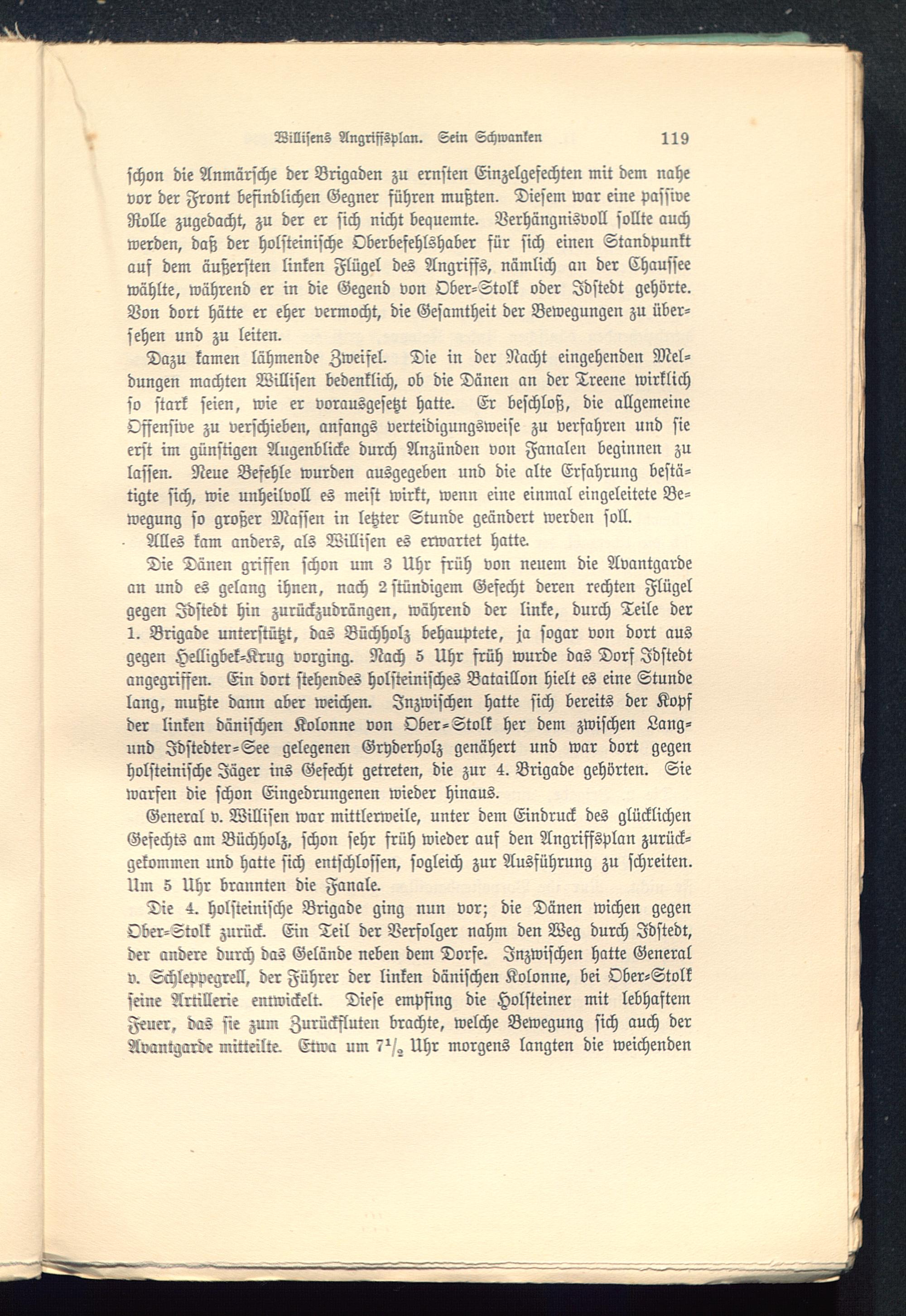 Die Dänen griffen schon um 3 Uhr früh von neuem die Avantgardean und es gelang ihnen, nach 2stündigem Gesecht deren rechten Flügelgegen Jdstedt hin zurückzudrängen, während der linke, durch Teile der1. Brigade unterstützt, das Büchholz behauptete, ja sogar von dort ausgegen Helligbek-Krug vorging. Nach 5 Uhr früh wurde das Dorf Jdstedtangegriffen. Ein dort stehendes holsteinisches Bataillon hielt es eine Stundelang, mußte dann aber weichen. Inzwischen hatte sich bereits der Kopfder linken dänischen Kolonne von Ober-Stolk her dem zwischen Lang-und Jdstedter-See gelegenen Gryderholz genähert und war dort gegenholsteinische Jäger ins Gefecht getreten, die zur 4. Brigade gehörten. Siewarfen die schon Eingedrungenen wieder hinaus.