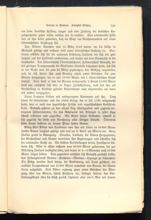 Seine Truppen blickten mit unbegrenztem Vertrauen auf ihn. Trotzseiner 82 Lebensjahre und der vielen Kriege, die er seit 1788 mitgemachthatte, war er noch von jugendlicher Frische und ungeschwächter Entschluß-kraft. Radetzky gehörte zu den allzeit klug überlegenden und zugleich ver-wegenen Führernaturen, die das Geheimnis des Erfolges in jeder Lageschnell erkennen und zugreifen. Ein Vater seiner Soldaten, erwarb ersich zugleich die Liebe und Verehrung aller übrigen Stände. Österreich hätte keinen besseren an seinem Platze haben können.