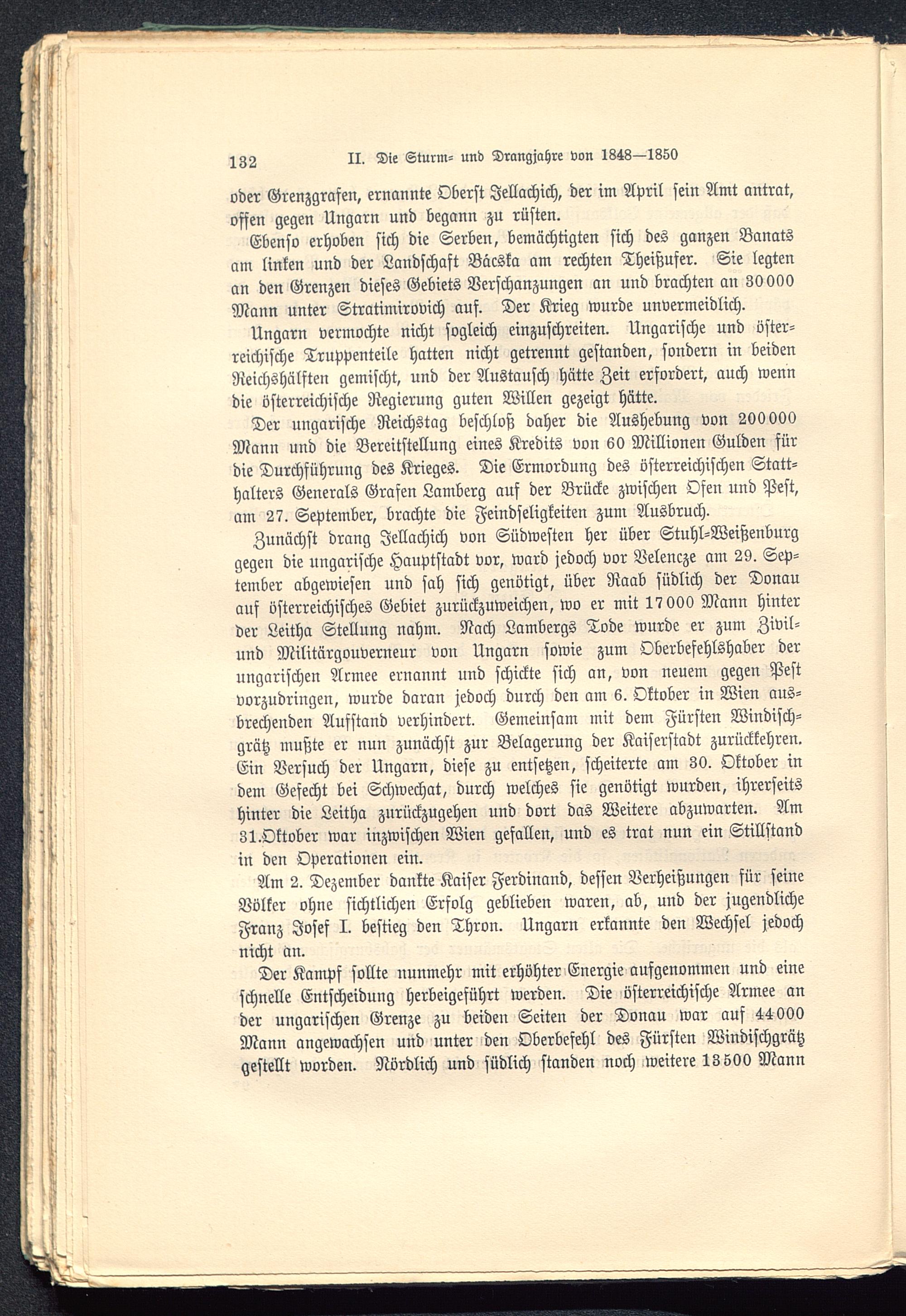 Der ungarische Reichstag beschloß daher die Aushebung von 200 000Mann und die Bereitstellung eines Kredits von 60 Millionen Gulden fürdie Durchführung des Krieges. Die Ermordung des österreichischen Statt-halters Generals Grafen Lamberg auf der Brücke zwischen Ofen und Pest,am 27. September, brachte die Feindseligkeiten zum Ausbruch.