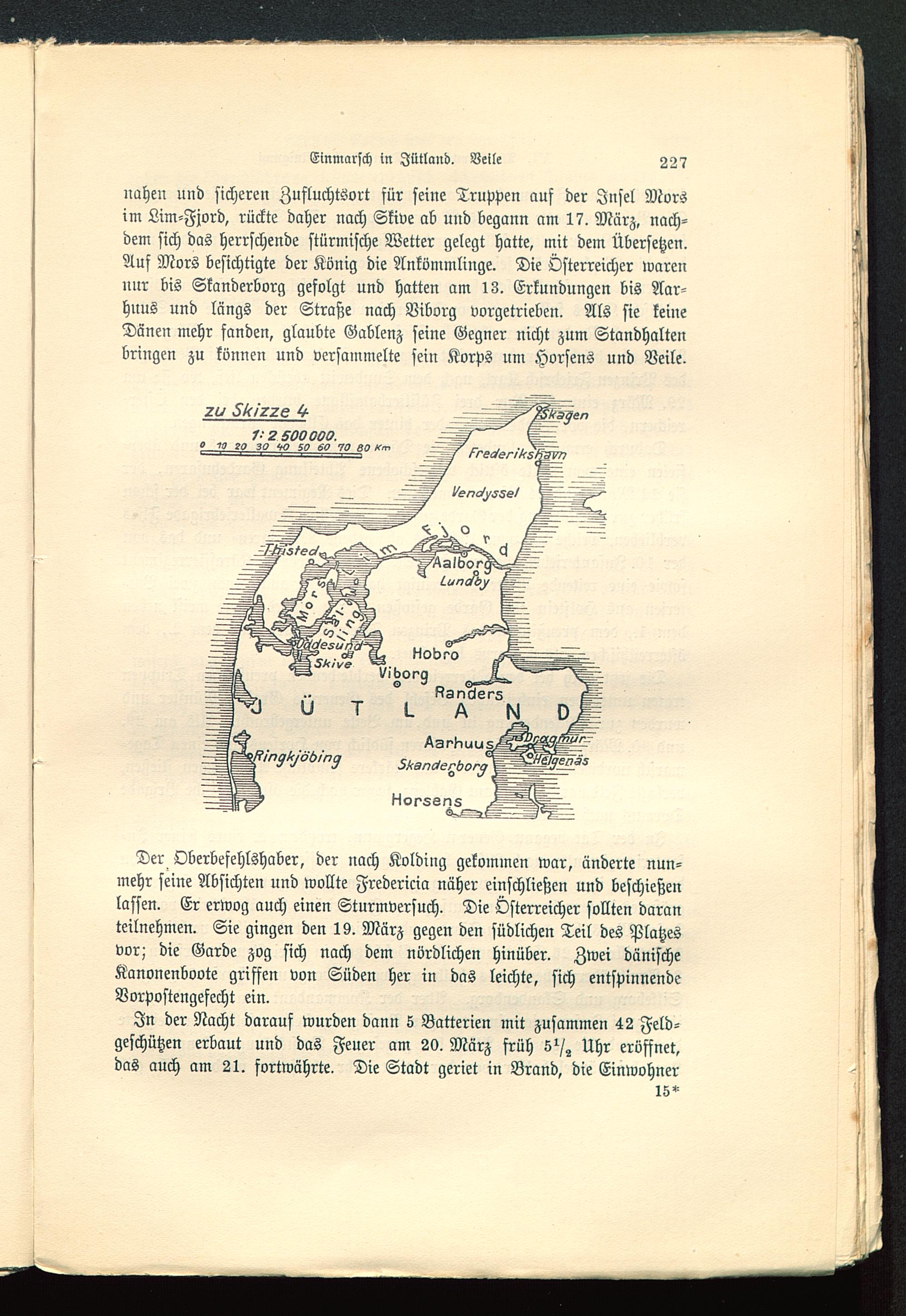 nahen und sicheren Zufluchtsort für seine Truppen auf der Insel Morsim Lim-Fjord, rückte daher nach Skive ab und begann am 17. März, nach-dem sich das herrschende stürmische Wetter gelegt hatte, mit dem Übersetzen.Auf Mors besichtigte der König die Ankömmlinge. Die Österreicher warennur bis Skanderborg gefolgt und hatten am 13. Erkundungen bis Aar-hnns und längs der Straße nach Viborg vorgetrieben. Als sie keineDänen mehr fanden, glaubte Gablenz seine Gegner nicht zum Standhaltenbringen zu können und versammelte sein Korps um Horsens und Veite.