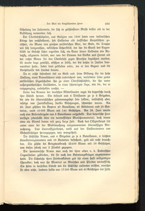 Der Oberbefehlshaber, aus Galizien von 1846 sowie vom italienischen Kriege her wohlbekannt, seit Solferino als trefflicher Korpsführer ge-rühmt, ein Mann von großem persönlichen Mut, der Gabe, die Truppemit sich fortzureißen, taktischem Scharfblick, der ihn die Gunst des Augen-blicks im Gefecht sicher ergreifen ließ, ein Vater seiner Soldaten wie Ra-detzky, allgemein beliebt, war von der Stimme des Volkes und Heeres alsder rechte Mann für den Oberbefehl gegen Preußen bezeichnet worden.Er wurde dazu gewählt, obschon er selbst, der bis dahin in Italien kom-mandiert hatte, lieber dort geblieben wäre, wo er den Gegner und dieVerhältnisse des Landes kannte.
