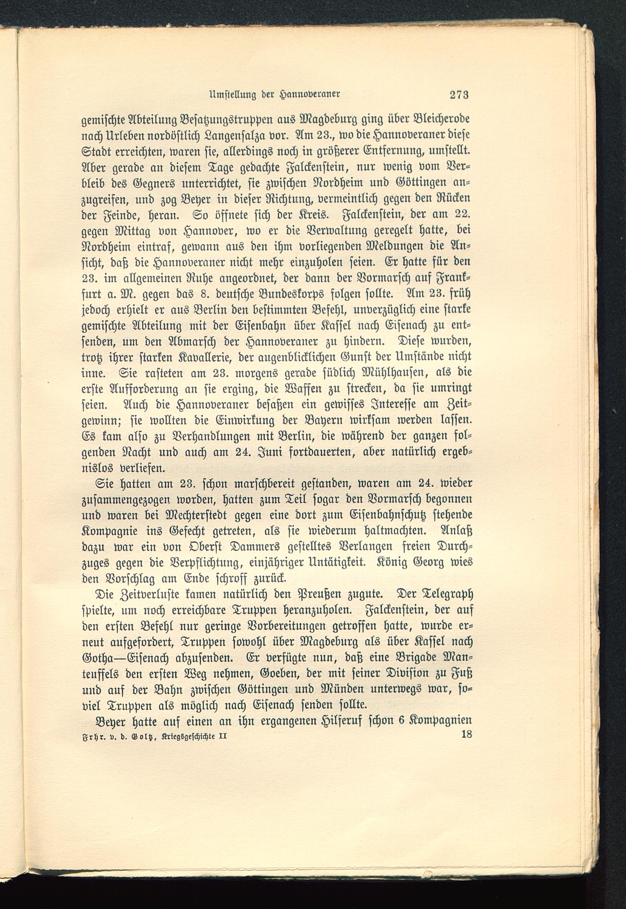 gemischte Abteilung Besatzungstruppen aus Magdeburg ging über Bleicherode nach Urleben nordöstlich Langensalza vor. Am 23., wo die Hannoveraner dieseStadt erreichten, waren sie, allerdings noch in größerer Entfernung, umstellt.Aber gerade an diesem Tage gedachte Falckenstein, nur wenig vom Ver-bleib des Gegners unterrichtet, sie zwischen Nordheim und Göttingen an-zugreisen, und zog Beyer in dieser Richtung, vermeintlich gegen den Rückender Feinde, heran. So öffnete sich der Kreis. Falckenstein, der am 22.gegen Mittag von Hannover , wo er die Verwaltung geregelt hatte, beiNordheim eintraf, gewann aus den ihm vorliegenden Meldungen die An-sicht, daß die Hannoveraner nicht mehr einzuholen seien. Er hatte für den23. im allgemeinen Ruhe angeordnet, der dann der Vormarsch auf Frank-furt a. M. gegen das 8. deutsche Bundeskorps folgen sollte. Am 23. frühjedoch erhielt er aus Berlin den bestimmten Befehl, unverzüglich eine starkegemischte Abteilung mit der Eisenbahn über Kassel nach Eisenach zu ent-senden, um den Abmarsch der Hannoveraner zu hindern. Diese wurden,trotz ihrer starken Kavallerie, der augenblicklichen Gunst der Umstände nichtinne. Sie rasteten am 23. morgens gerade südlich Mühlhausen, als dieerste Aufforderung an sie erging, die Waffen zu strecken, da sie umringtseien. Auch die Hannoveraner besaßen ein gewisses Interesse am Zeit-gewinn; sie wollten die Einwirkung der Bayern wirksam werden lassen.Es kam also zu Verhandlungen mit Berlin , die während der ganzen fol-genden Nacht und auch am 24. Juni fortdauerten, aber natürlich ergeb-nislos verliefen.