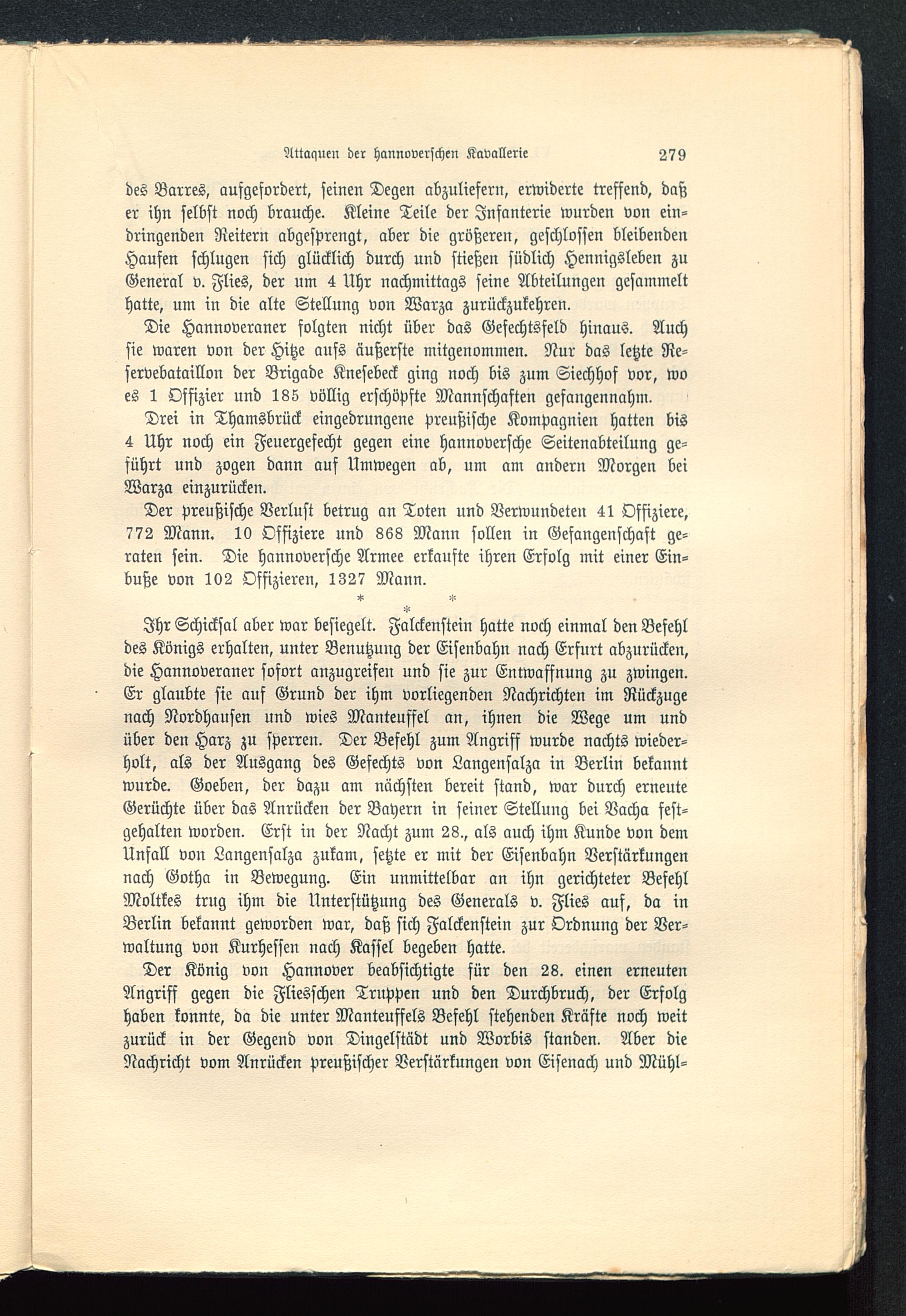 des Barres, aufgefordert, feinen Degen abzuliefern, erwiderte treffend, daßer ihn selbst noch brauche. Kleine Teile der Infanterie wurden von ein-dringenden Reitern abgesprengt, aber die größeren, geschlossen bleibendenHaufen schlugen sich glücklich durch und stießen südlich Hennigsleben zuGeneral v. Flies, der um 4 Uhr nachmittags seine Abteilungen gesammelthatte, um in die alte Stellung von Warza zurückzukehren.