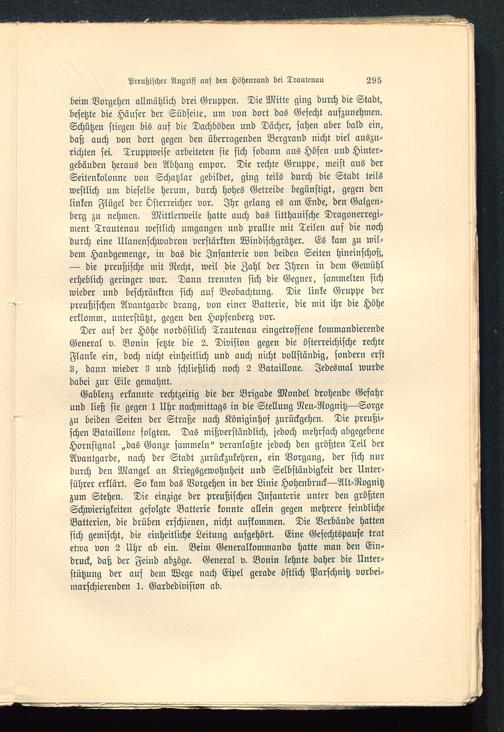 beim Vorgehen allmählich drei Gruppen. Die Mitte ging durch die Stadt,besetzte die Häuser der Südseite, um von dort das Gefecht aufzunehmen.Schützen stiegen bis auf die Dachböden und Dächer, sahen aber bald ein,daß auch von dort gegen den überragenden Bergrand nicht viel auszu-richten sei. Truppweise arbeiteten sie sich sodann aus Höfen und Hinter-gebäuden heraus den Abhang empor. Die rechte Gruppe, meist aus derSeitenkolonne von Schatzlar gebildet, ging teils durch die Stadt teilswestlich um dieselbe herum, durch hohes Getreide begünstigt, gegen denlinken Flügel der Österreicher vor. Ihr gelang es am Ende, den Galgen-berg zu nehmen. Mittlerweile hatte auch das litthauische Dragonerregi-ment Trautenau westlich umgangen und prallte mit Teilen auf die nochdurch eine Ulanenschwadron verstärkten Windischgrätzer. Es kam zu wil-dem Handgemenge, in das die Infanterie von beiden Seiten hineinschoß,— die preußische mit Recht, weil die Zahl der Ihren in dem Gewühlerheblich geringer war. Dann trennten sich die Gegner, sammelten sichwieder und beschränkten sich auf Beobachtung. Die linke Gruppe derpreußischen Avantgarde drang, von einer Batterie, die mit ihr die Höheerklomm, unterstützt, gegen den Hopfenberg vor.