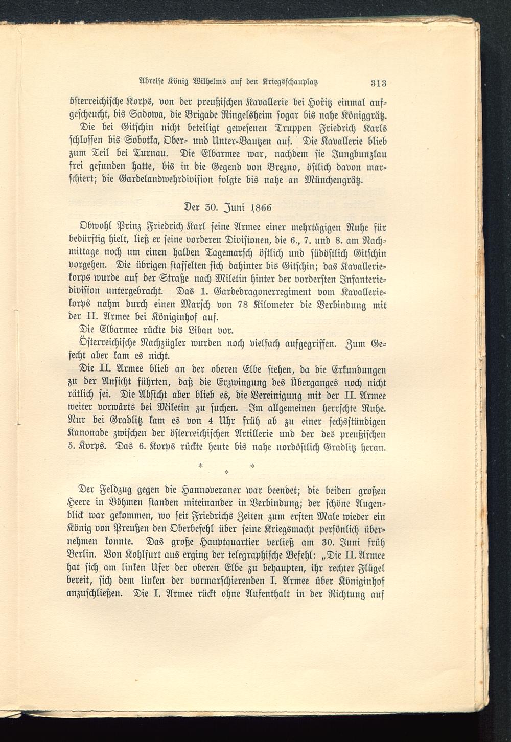Obwohl Prinz Friedrich Karl seine Armee einer mehrtägigen Ruhe fürbedürftig hielt, ließ er seine vorderen Divisionen, die 6.^ 7. und 8. am Nach-mittage noch um einen halben Tagemarsch östlich und südöstlich Gitschinvorgehen. Die übrigen staffelten sich dahinter bis Gitschin ; das Kavallerie-korps wurde auf der Straße nach Miletin hinter der vordersten Infanterie-division untergebracht. Das 1. Gardedragonerregiment vom Kavallerie-korps nahm durch einen Marsch von 73 Kilometer die Verbindung mitder II. Armee bei Königinhof auf.