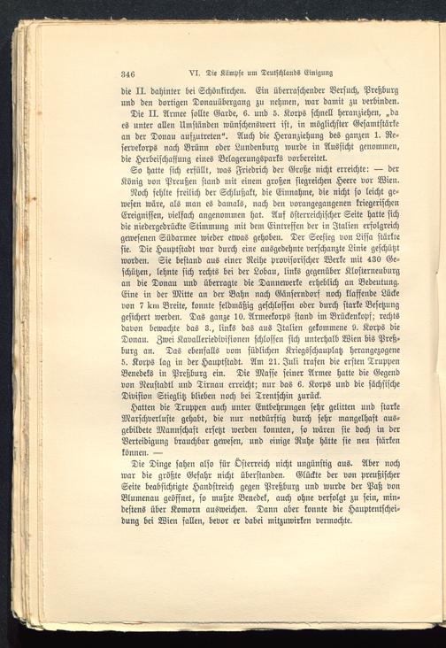 Noch fehlte freilich der Schlußakt, die Einnahme, die nicht so leicht ge-wesen wäre, als man es damals, nach den vorangegangenen kriegerischenEreignissen, vielfach angenommen hat. Auf österreichischer Seite hatte sichdie niedergedrückte Stimmung mit dem Eintreffen der in Italien erfolgreichgewesenen Südarmee wieder etwas gehoben. Der Seesieg von Lissa stärktesie. Die Hauptstadt war durch eine ausgedehnte verschanzte Linie geschütztworden. Sie bestand aus einer Reihe provisorischer Werke mit 430 Ge-schützen, lehnte sich rechts bei der Lobau, links gegenüber Klosterneuburg an die Donau und überragte die Dannewerke erheblich an Bedeutung.Eine in der Mitte an der Bahn nach Gänserndorf noch klaffende Lückevon 7 Breite, konnte feldmäßig geschloffen oder durch starke Besetzunggesichert werden. Das ganze 10. Armeekorps stand im Brückenkopf; rechtsdavon bewachte das 3., links das aus Italien gekommene 9. Korps dieDonau. Zwei Kavalleriedivisionen schloffen sich unterhalb Wien bis Preß-burg an. Das ebenfalls vom südlichen Kriegsschauplatz herangezogeneS. Korps lag in der Hauptstadt. Am 21. Juli trafen die ersten TruppenBenedeks in Preßburg ein. Die Masse seiner Armee hatte die Gegendvon Neustadtl und Tirnau erreicht; nur das 6. Korps und die sächsischeDivision Stieglitz blieben noch bei Trentschin zurück.