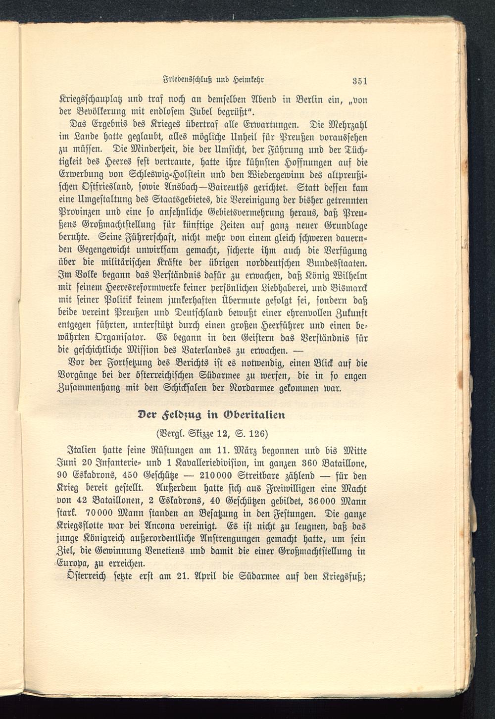 Italien hatte seine Rüstungen am 11. März begonnen und bis MitteJuni 20 Infanterie- und 1 Kavalleriedivision, im ganzen 360 Bataillone,90 Eskadrons, 450 Geschütze — 210000 Streitbare zählend — für denKrieg bereit gestellt. Außerdem hatte sich aus Freiwilligen eine Machtvon 42 Bataillonen, 2 Eskadrons, 40 Geschützen gebildet, 36 000 Mannstark. 70 000 Mann standen an Besatzung in den Festungen. Die ganzeKriegsflotte war bei Ancona vereinigt. Es ist nicht zu leugnen, daß dasjunge Königreich außerordentliche Anstrengungen gemacht hatte, um seinZiel, die Gewinnung Venetiens und damit die einer Großmachtstellung inEuropa , zu erreichen.