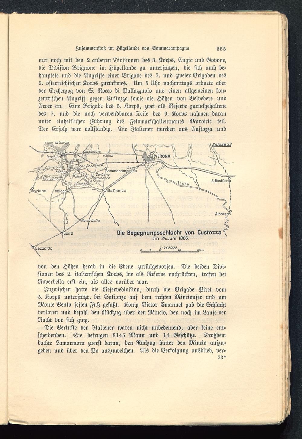 Inzwischen hatte die Reservedivision, durch die Brigade Piret vom5. Korps unterstützt, bei Salionze auf dem rechten Mincioufer und amMonte Vento festen Fuß gefaßt. König Victor Emanuel gab die Schlachtverloren und befahl den Rückzug über den Mincio, der noch im Laufe derNacht vor sich ging.