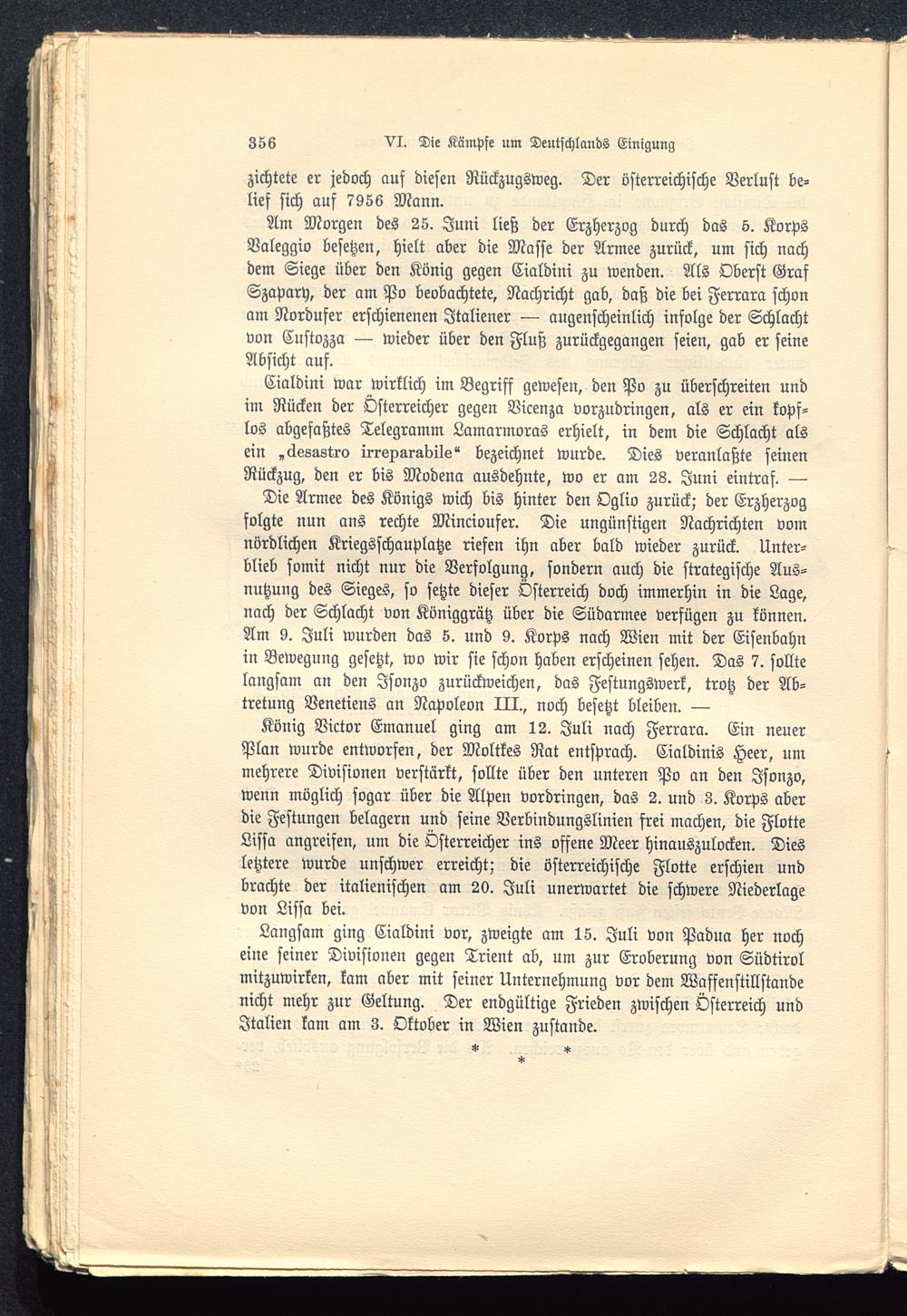 Die Armee des Königs wich bis hinter den Oglio zurück; der Erzherzogfolgte nun ans rechte Mincioufer. Die ungünstigen Nachrichten vomnördlichen Kriegsschauplatze riefen ihn aber bald wieder zurück. Unter-blieb somit nicht nur die Verfolgung, sondern auch die strategische Aus-nutzung des Sieges, so setzte dieser Österreich doch immerhin in die Lage,nach der Schlacht von Königgrätz über die Südarmee verfügen zu können.Am 9. Juli wurden das 5. und 9. Korps nach Wien mit der Eisenbahnin Bewegung gesetzt, wo wir sie schon haben erscheinen sehen. Das 7. solltelangsam an den Jsonzo zurückweichen, das Festungswerk, trotz der Ab-tretung Venetiens an Napoleon III. , noch besetzt bleiben. —