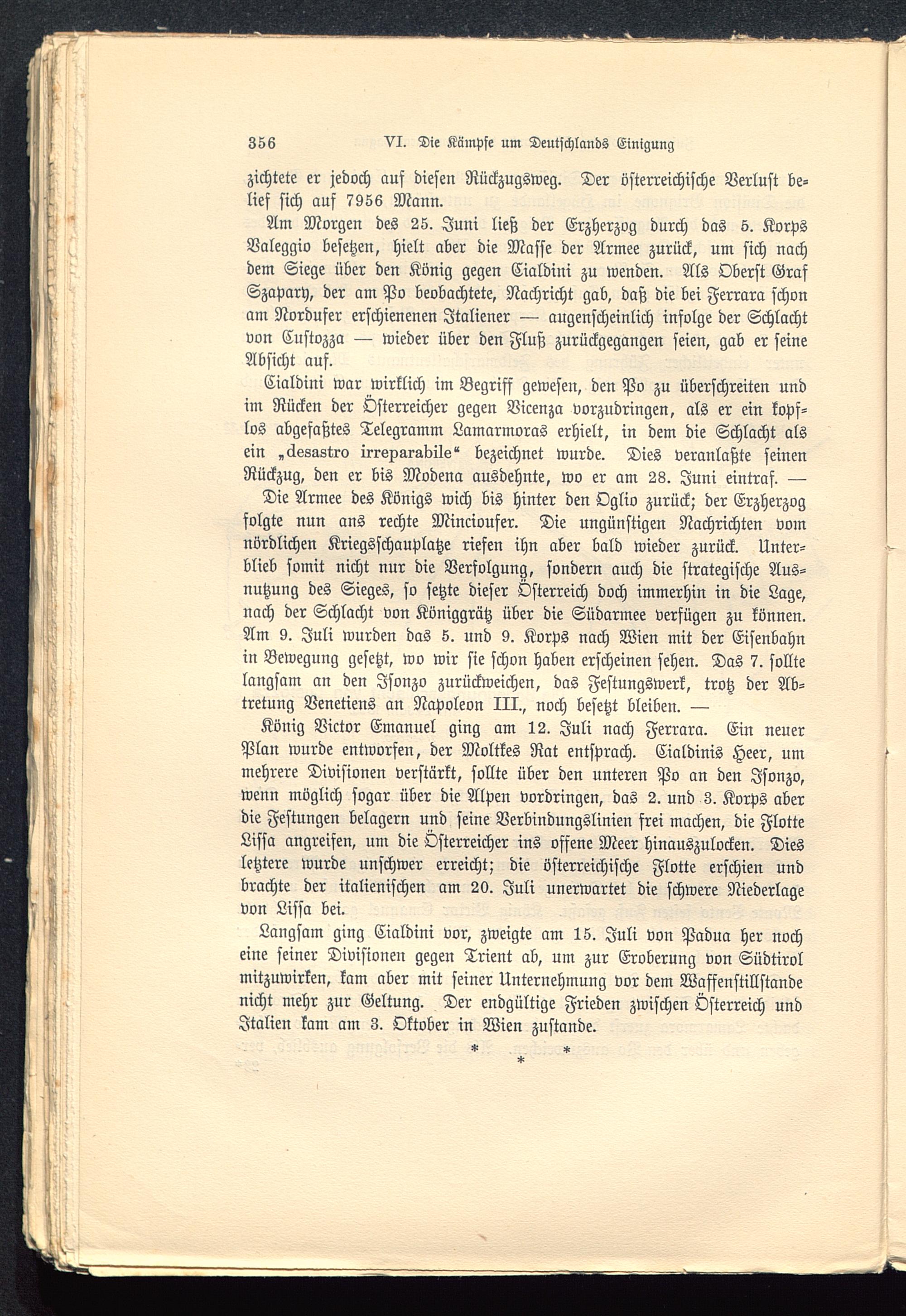 Am Morgen des 25. Juni ließ der Erzherzog durch das 5. KorpsValeggio besetzen, hielt aber die Masse der Armee zurück, um sich nachdem Siege über den König gegen Cialdini zu wenden. Als Oberst GrafSzapary, der am Po beobachtete, Nachricht gab, daß die bei Ferrara schonam Nordufer erschienenen Italiener — augenscheinlich infolge der Schlachtvon Custozza — wieder über den Fluß zurückgegangen seien, gab er seineAbsicht auf.