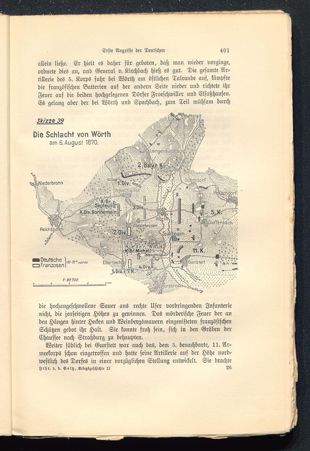 die hochaugeschwollene Sauer ans rechte Ufer vordringenden Infanterienicht, die jenseitigen Höhen zu gewinnen. Das mörderische Feuer der anden Hängen hinter Hecken und Weinbergsmauern eingenisteten französischenSchützen gebot ihr Halt. Sie konnte froh sein, sich in den Gräben derChaussee nach Straßburg zu behaupten.