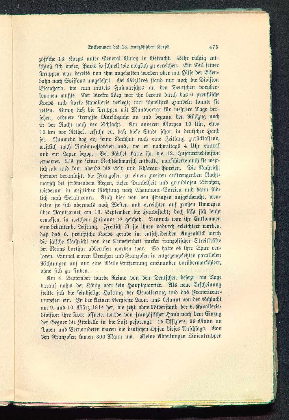 zösische 13. Korps unter General Vinoy in Betracht. Sehr richtig ent-schloß sich dieser, Paris so schnell wie möglich zu erreichen. Ein Teil seinerTruppen war bereits von ihm angehalten worden oder mit Hilfe der Eisen-bahn nach Soissons umgekehrt. Bei Mezieres stand nur noch die DivisionBlanchard, die nun mittels Fußmarsches an den Deutschen vorübcr-kommen mußte. Der direkte Weg war ihr bereits durch das 6. preußischeKorps und starke Kavallerie verlegt; nur schnellstes Handeln konnte sieretten. Vinoy ließ die Truppen mit Mundvorrat für mehrere Tage ver-sehen, ordnete strengste Marschzucht an und begann den Rückzug nochin der Nacht nach der Schlacht. Am anderen Morgen 10 Uhr, etwa10 lim vor Rethel, erfuhr er, daß diese Stadt schon in deutscher Handsei. Nunmehr bog er, seine Nachhut noch eine Zeitlang zurücklassend,westlich nach Novion-Porcien aus, wo er nachmittags 4 Uhr eintrafund ein Lager bezog. Bei Rethel hatte ihn die 12. Infanteriedivisionerwartet. Als sie seinen Rechtsabmarsch entdeckte, marschierte auch sie west-lich, ab und kam abends bis Ecly und ClMeau-Porcien. Die Nachrichthiervon veranlaßte die Franzosen zu einem zweiten anstrengenden Nacht-marsch bei strömendem Regen, tiefer Dunkelheit und grundlosen Straßen,wiederum in westlicher Richtung nach Chaumont-Porcien und dann süd-lich nach Seraincourt. Auch hier von den Preußen aufgescheucht, wen-deten sie sich abermals nach Westen und erreichten auf großen Umwegenüber Montcornet am 13. September die Hauptstadt; doch läßt sich leichtermessen, in welchem Zustande es geschah. Dennoch war ihr Entkommeneine bedeutende Leistung. Freilich ist sie ihnen dadurch erleichtert worden,daß das 6. preußische Korps gerade im entscheidenden Augenblick durchdie falsche Nachricht von der Anwesenheit starker französischer Streitkräftebei Reims dorthin abberufen worden war. So hatte es ihre Spur ver-loren. Einmal waren Preußen und Franzosen in entgegengesetzten parallelenRichtungen auf nur eine Meile Entfernung aneinander vorübermarschiert,ohne sich zu finden. —