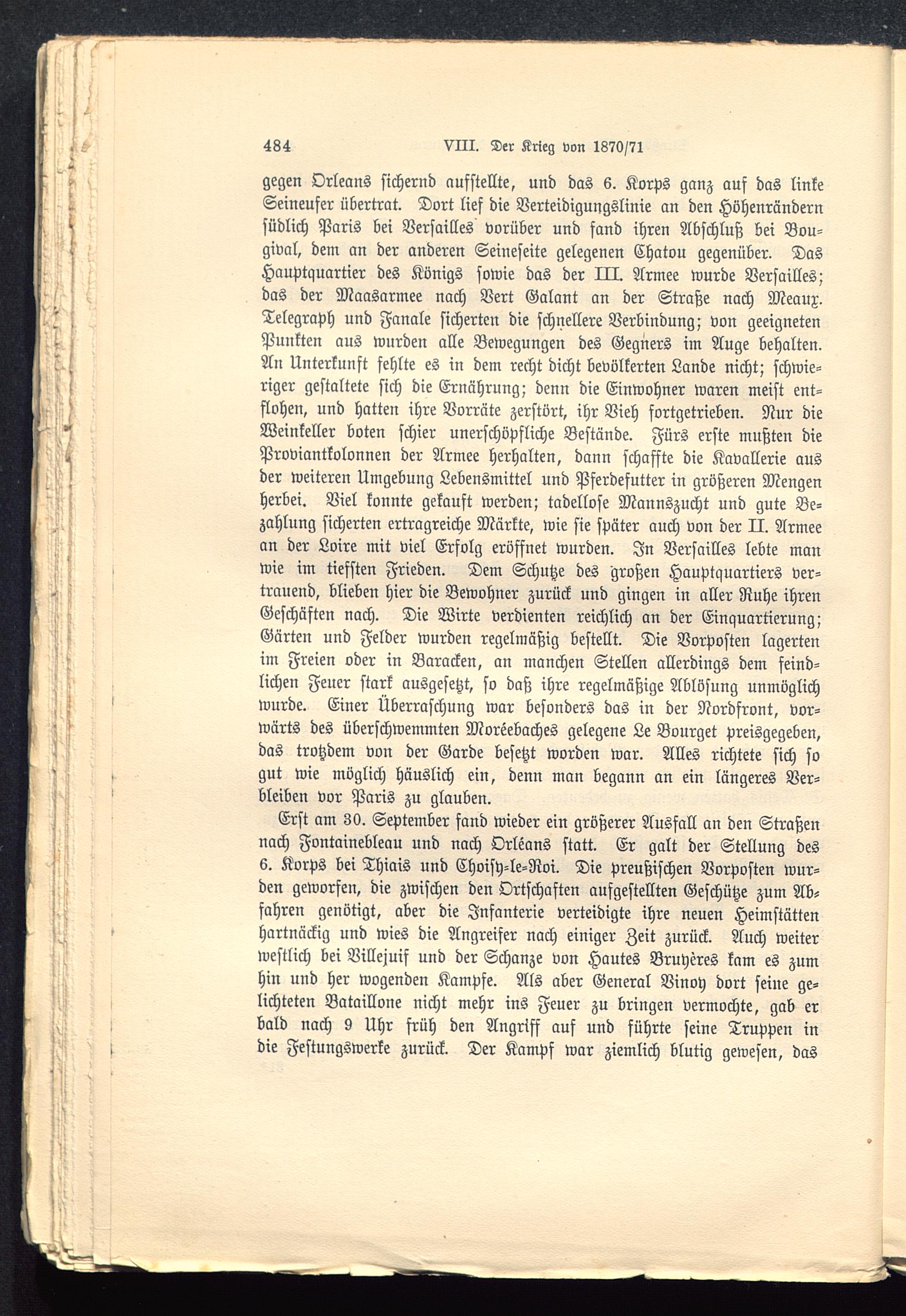gegen Orleans sichernd aufstellte, und das 6. Korps ganz auf das linkeSeineufer übertrat. Dort lief die Verteidigungslinie an den Höhenrändernsüdlich Paris bei Versailles vorüber und fand ihren Abschluß bei Bou-gival, dem an der anderen Seineseite gelegenen Chatou gegenüber. DasHauptquartier des Königs sowie das der III. Armee wurde Versailles ;das der Maasarmee nach Vert Galant an der Straße nach Meaux .Telegraph und Fanale sicherten die schnellere Verbindung; von geeignetenPunkten aus wurden alle Bewegungen des Gegners im Auge behalten.An Unterkunft fehlte es in dem recht dicht bevölkerten Lande nicht; schwie-riger gestaltete sich die Ernährung; denn die Einwohner waren meist ent-flohen, und hatten ihre Vorräte zerstört, ihr Vieh fortgetrieben. Nur dieWeinkeller boten schier unerschöpfliche Bestände. Fürs erste mußten dieProviantkolonnen der Armee herhalten, dann schaffte die Kavallerie ausder weiteren Umgebung Lebensmittel und Pferdefutter in größeren Mengenherbei. Viel konnte gekauft werden; tadellose Mannszucht und gute Be-zahlung sicherten ertragreiche Märkte, wie sie später auch von der II. Armeean der Loire mit viel Erfolg eröffnet wurden. In Versailles lebte manwie im tiefsten Frieden. Dem Schutze des großen Hauptquartiers ver-trauend, blieben hier die Bewohner zurück und gingen in aller Ruhe ihrenGeschäften nach. Die Wirte verdienten reichlich an der Einquartierung;Gärten und Felder wurden regelmäßig bestellt. Die Vorposten lagertenim Freien oder in Baracken, an manchen Stellen allerdings dem feind-lichen Feuer stark ausgesetzt, so daß ihre regelmäßige Ablösung unmöglichwurde. Einer Überraschung war besonders das in der Nordfront, vor-wärts des überschwemmten Moreebaches gelegene Le Bourget preisgegeben,das trotzdem von der Garde besetzt worden war. Alles richtete sich sogut wie möglich häuslich ein, denn man begann an ein längeres Ver-bleiben vor Paris zu glauben.