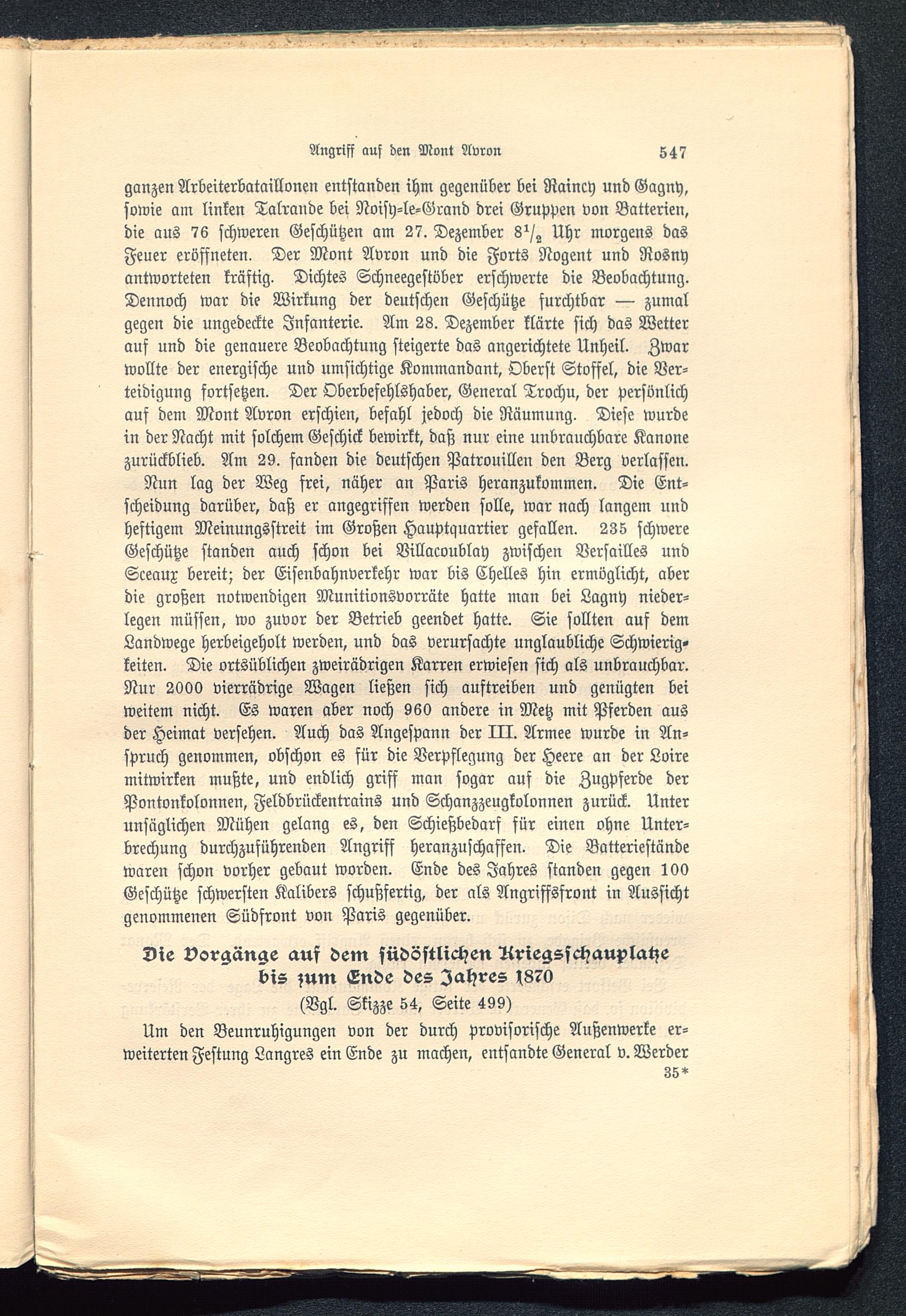 Nun lag der Weg frei, näher an Paris heranzukommen. Die Ent-scheidung darüber, daß er angegriffen werden solle, war nach langem undheftigem Meinungsstreit im Großen Hauptquartier gefallen. 235 schwereGeschütze standen auch schon bei Villacoublay zwischen Versailles undSceaux bereit; der Eisenbahnverkehr war bis Chelles hin ermöglicht, aberdie großen notwendigen Munitionsvorräte hatte man bei Lagny nieder-legen müssen, wo zuvor der Betrieb geendet hatte. Sie sollten auf demLandwege herbeigeholt werden, und das verursachte unglaubliche Schwierig-keiten. Die ortsüblichen zweirädrigen Karren erwiesen sich als unbrauchbar.Nur 2000 vierrädrige Wagen ließen sich auftreiben und genügten beiweitem nicht. Es waren aber noch 960 andere in Metz mit Pferden ausder Heimat versehen. Auch das Angespann der III. Armee wurde in An-spruch genommen, obschon es für die Verpflegung der Heere an der Loire mitwirken mußte, und endlich griff man sogar auf die Zugpferde derPontonkolonnen, Feldbrückentrains und Schanzzeugkolonnen zurück. Unterunsäglichen Mühen gelang es, den Schießbedarf für einen ohne Unter-brechung durchzuführenden Angriff heranzuschaffen. Die Batterieständewaren schon vorher gebaut worden. Ende des Jahres standen gegen 100Geschütze schwersten Kalibers schußfertig, der als Angriffsfront in Aussichtgenommenen Südfront von Paris gegenüber.