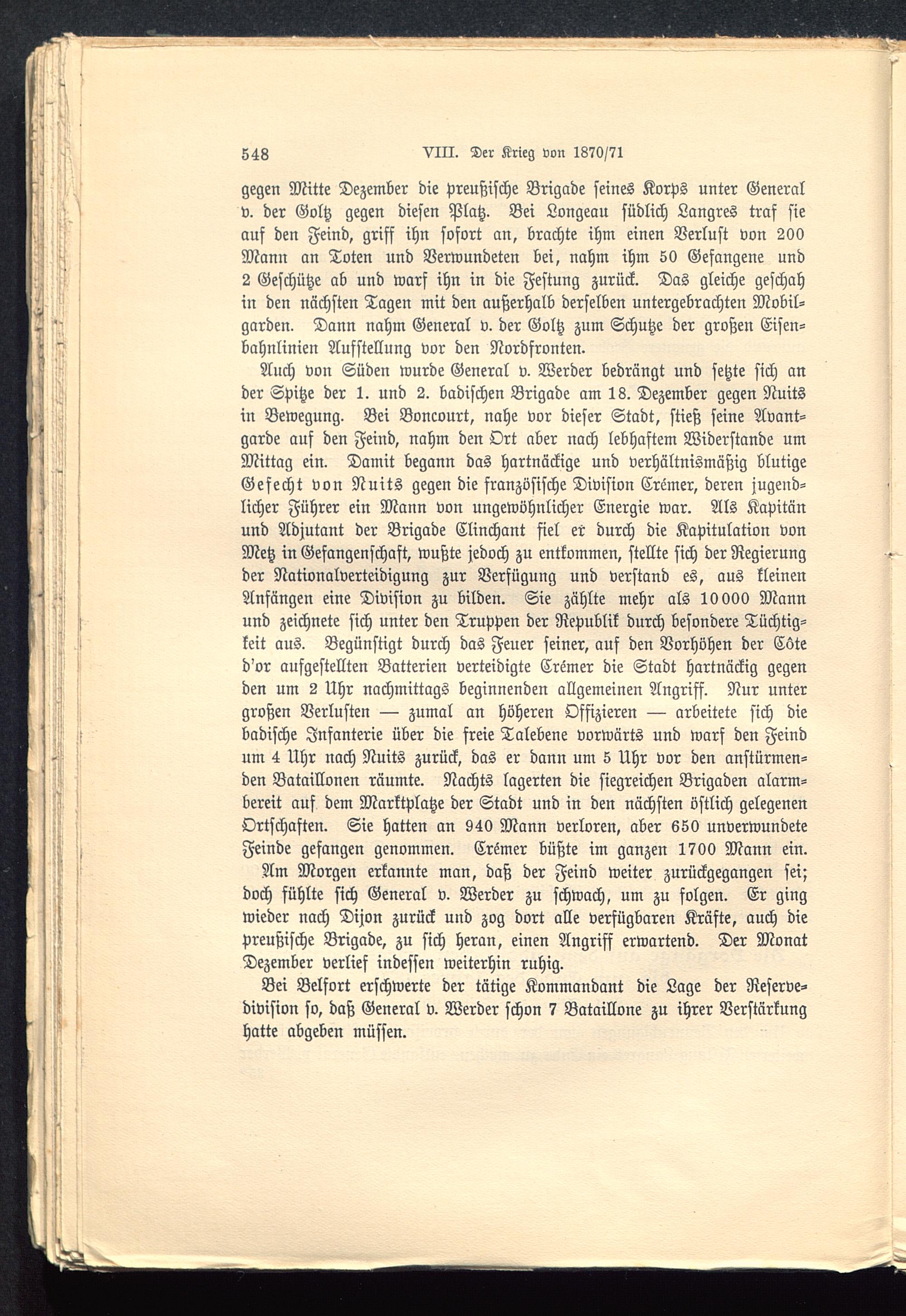 Auch von Süden wurde General v. Werder bedrängt und setzte sich ander Spitze der 1. und 2. badischen Brigade am 18. Dezember gegen Nuitsin Bewegung. Bei Boncourt , nahe vor dieser Stadt, stieß seine Avant-garde auf den Feind, nahm den Ort aber nach lebhaftem Widerstande umMittag ein. Damit begann das hartnäckige und verhältnismäßig blutigeGefecht von Nuits gegen die französische Division Cremer, deren jugend-licher Führer ein Mann von ungewöhnlicher Energie war. Als Kapitänund Adjutant der Brigade Clinchant fiel er durch die Kapitulation vonMetz in Gefangenschaft, wußte jedoch zu entkommen, stellte sich der Regierungder Nationalverteidigung zur Verfügung und verstand es, aus kleinenAnfängen eine Division zu bilden. Sie zählte mehr als 10 000 Mannund zeichnete sich unter den Truppen der Republik durch besondere Tüchtig-keit aus. Begünstigt durch das Feuer seiner, auf den Vorhöhen der Cüted'or aufgestellten Batterien verteidigte Cremer die Stadt hartnäckig gegenden um 2 Uhr nachmittags beginnenden allgemeinen Angriff. Nur untergroßen Verlusten — zumal an höheren Offizieren — arbeitete sich diebadische Infanterie über die freie Talebene vorwärts und warf den Feindum 4 Uhr nach Nuits zurück, das er dann um 5 Uhr vor den anstürmen-den Bataillonen räumte. Nachts lagerten die siegreichen Brigaden alarm-bereit auf dem Marktplatze der Stadt und in den nächsten östlich gelegenenOrtschaften. Sie hatten an 940 Mann verloren, aber 650 unverwundeteFeinde gefangen genommen. Cremer büßte im ganzen 1700 Mann ein.