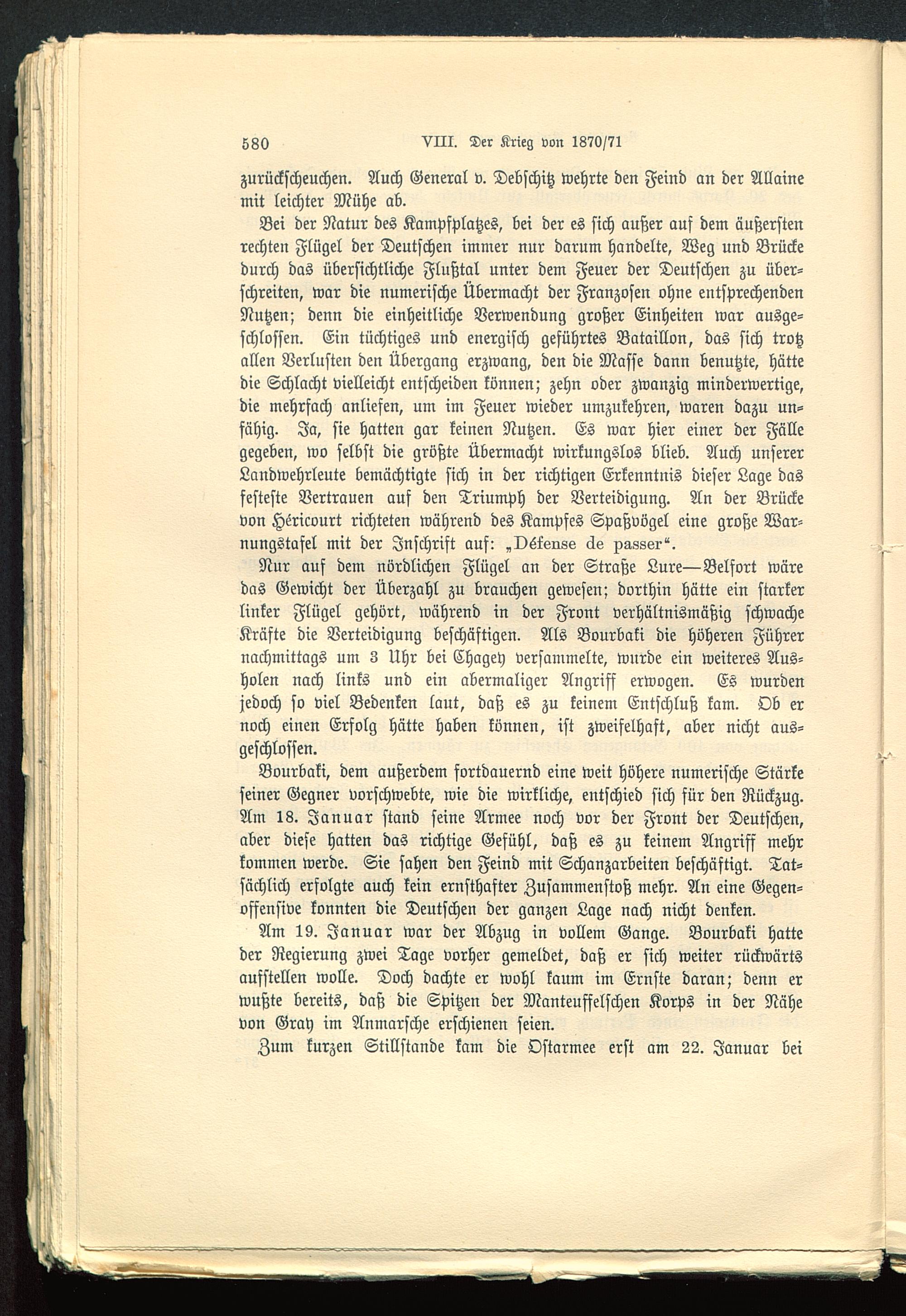 Bourbaki , dem außerdem fortdauernd eine weit höhere numerische Stärkeseiner Gegner vorschwebte, wie die wirkliche, entschied sich für den Rückzug.Am 18. Januar stand seine Armee noch vor der Front der Deutschen,aber diese hatten das richtige Gefühl, daß es zu keinem Angriff mehrkommen werde. Sie sahen den Feind mit Schanzarbeiten beschäftigt. Tat-sächlich erfolgte auch kein ernsthafter Zusammenstoß mehr. An eine Gegen-offensive konnten die Deutschen der ganzen Lage nach nicht denken.