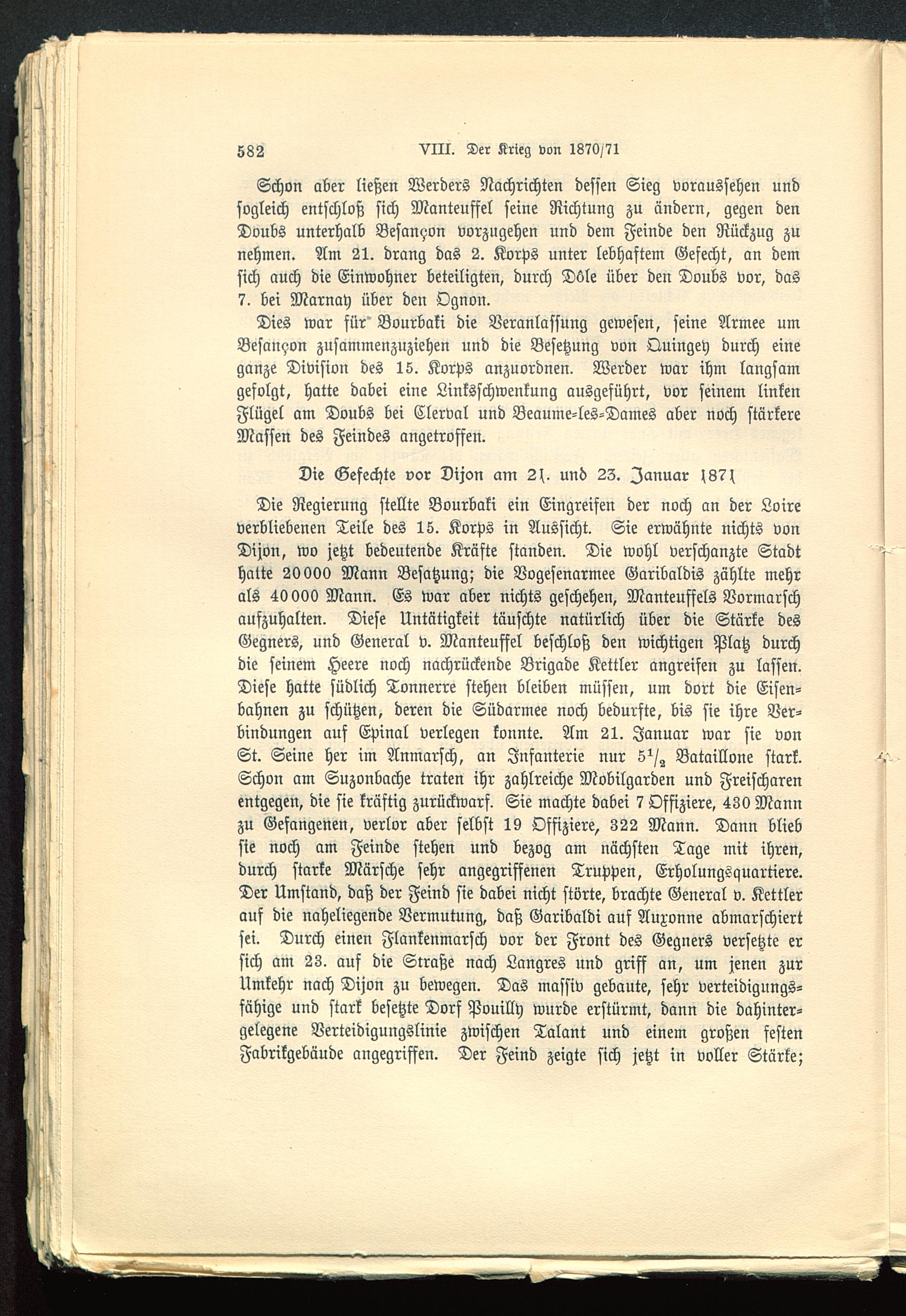 Die Regierung stellte Bourbaki ein Eingreifen der noch an der Loire verbliebenen Teile des 15. Korps in Aussicht. Sie erwähnte nichts vonDijon , wo jetzt bedeutende Kräfte standen. Die wohl verschanzte Stadthatte 20 000 Mann Besatzung; die Vogesenarmee Garibaldis zählte mehrals 40 000 Mann. Es war aber nichts geschehen, Manteuffels Vormarschaufzuhalten. Diese Untätigkeit täuschte natürlich über die Stärke desGegners, und General v. Manteuffel beschloß den wichtigen Platz durchdie seinem Heere noch nachrückende Brigade Kettler angreifen zu lassen.Diese hatte südlich Tonnerre stehen bleiben müssen, um dort die Eisen-bahnen zu schützen, deren die Südarmee noch bedürfte, bis sie ihre Ver-bindungen auf Epinal verlegen konnte. Am 21. Januar war sie vonSt. Seine her im Anmarsch, an Infanterie nur 5^ Bataillone stark.Schon am Suzonbache traten ihr zahlreiche Mobilgarden und Freischarenentgegen, die sie kräftig zurückwarf. Sie machte dabei 7 Offiziere, 430 Mannzu Gefangenen, verlor aber selbst 19 Offiziere, 322 Mann. Dann bliebsie noch am Feinde stehen und bezog am nächsten Tage mit ihren,durch starke Märsche sehr angegriffenen Truppen, Erholungsquartiere.Der Umstand, daß der Feind sie dabei nicht störte, brachte General v. Kettlerauf die naheliegende Vermutung, daß Garibaldi auf Auxonne abmarschiertsei. Durch einen Flankenmarsch vor der Front des Gegners versetzte ersich am 23. auf die Straße nach Langres und griff an, um jenen zurUmkehr nach Dijon zu bewegen. Das massiv gebaute, sehr verteidigungs-fähige und stark besetzte Dorf Pouilly wurde erstürmt, dann die dahinter-gelegene Verteidigungslinie zwischen Talant und einem großen festenFabrikgebäude angegriffen. Der Feind zeigte sich jetzt in voller Stärke;