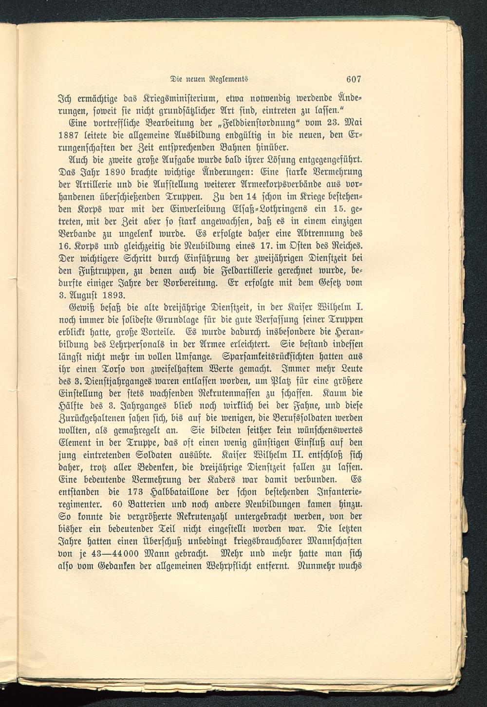Auch die zweite große Aufgabe wurde bald ihrer Lösung entgegengeführt.Das Jahr 1890 brachte wichtige Änderungen: Eine starke Vermehrungder Artillerie und die Aufstellung weiterer Armeekorpsverbände aus vor-handenen überschießenden Truppen. Zu den 14 schon im Kriege bestehen-den Korps war mit der Einverleibung Elsaß-Lothringens ein 15. ge-treten, mit der Zeit aber so stark angewachsen, daß es in einem einzigenVerbände zu ungelenk wurde. Es erfolgte daher eine Abtrennung des16. Korps und gleichzeitig die Neubildung eines 17. im Osten des Reiches.Der wichtigere Schritt durch Einführung der zweijährigen Dienstzeit beiden Fußtruppen, zu denen auch die Feldartillerie gerechnet wurde, be-dürfte einiger Jahre der Vorbereitung. Er erfolgte mit dem Gesetz vom3. August 1893.