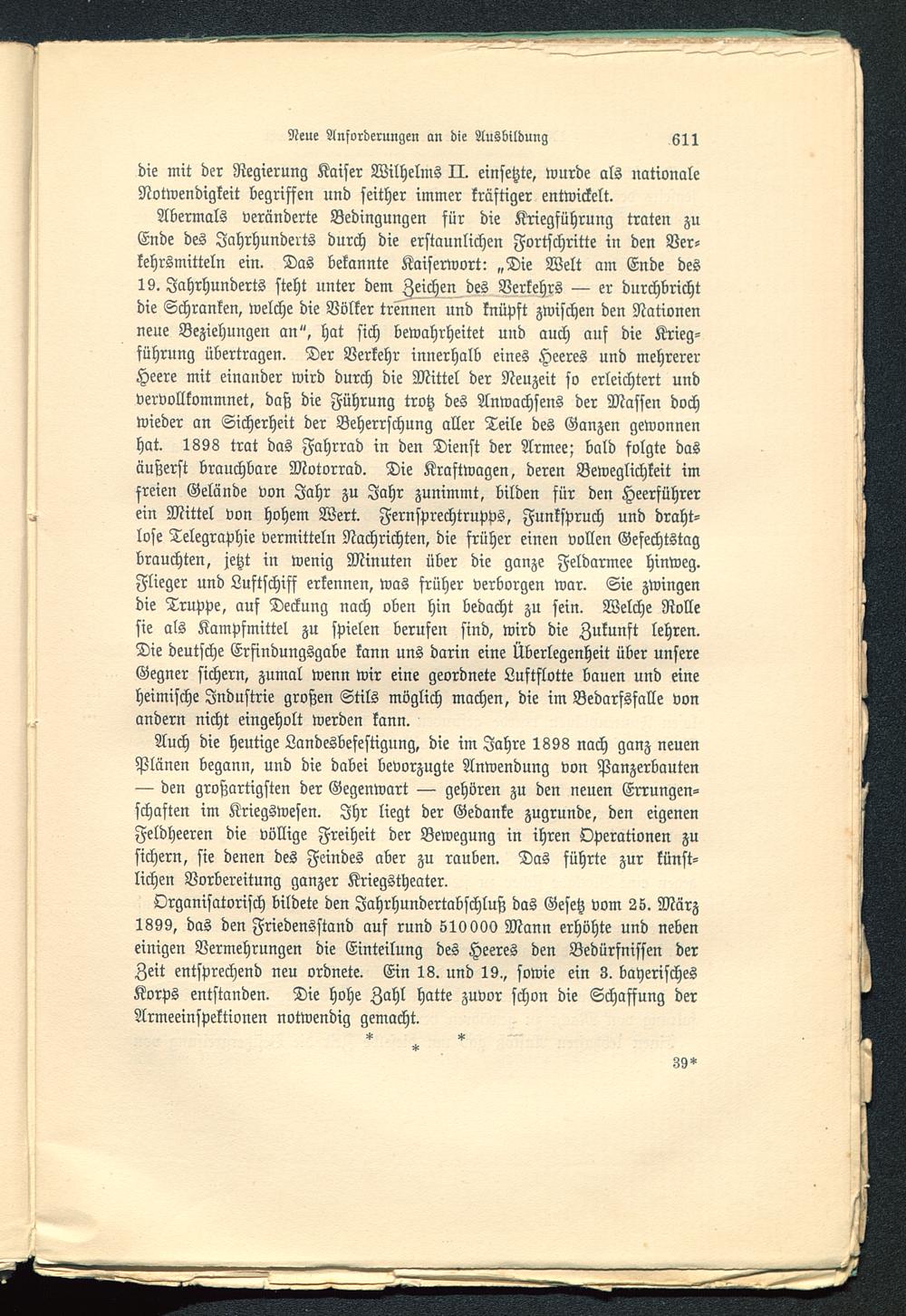 Abermals veränderte Bedingungen für die Kriegführung traten zuEnde des Jahrhunderts durch die erstaunlichen Fortschritte in den Ver-kehrsmitteln ein. Das bekannte Kaiserwort: „Die Welt am Ende des19. Jahrhunderts steht unter dem Zeichen des Verkehrs — er durchbrichtdie Schranken, welche die Völker trennen und knüpft zwischen den Nationenneue Beziehungen an", hat sich bewahrheitet und auch auf die Krieg-führung übertragen. Der Verkehr innerhalb eines Heeres und mehrererHeere mit einander wird durch die Mittel der Neuzeit so erleichtert undvervollkommnet, daß die Führung trotz des Anwachsens der Massen dochwieder an Sicherheit der Beherrschung aller Teile des Ganzen gewonnenhat. 1898 trat das Fahrrad in den Dienst der Armee; bald folgte dasäußerst brauchbare Motorrad. Die Kraftwagen, deren Beweglichkeit imsreien Gelände von Jahr zu Jahr zunimmt, bilden für den Heerführerein Mittel von hohem Wert. Fernsprechtrupps, Funkspruch und draht-lose Telegraphie vermitteln Nachrichten, die früher einen vollen Gefechtstagbrauchten, jetzt in wenig Minuten über die ganze Feldarmee hinweg.Flieger und Luftschiff erkennen, was früher verborgen war. Sie zwingendie Truppe, auf Deckung nach oben hin bedacht zu sein. Welche Rollesie als Kampfmittel zu spielen berufen sind, wird die Zukunft lehren.Die deutsche Erfindungsgabe kann uns darin eine Überlegenheit über unsereGegner sichern, zumal wenn wir eine geordnete Luftflotte bauen und eineheimische Industrie großen Stils möglich machen, die im Bedarfsfalle vonandern nicht eingeholt werden kann.