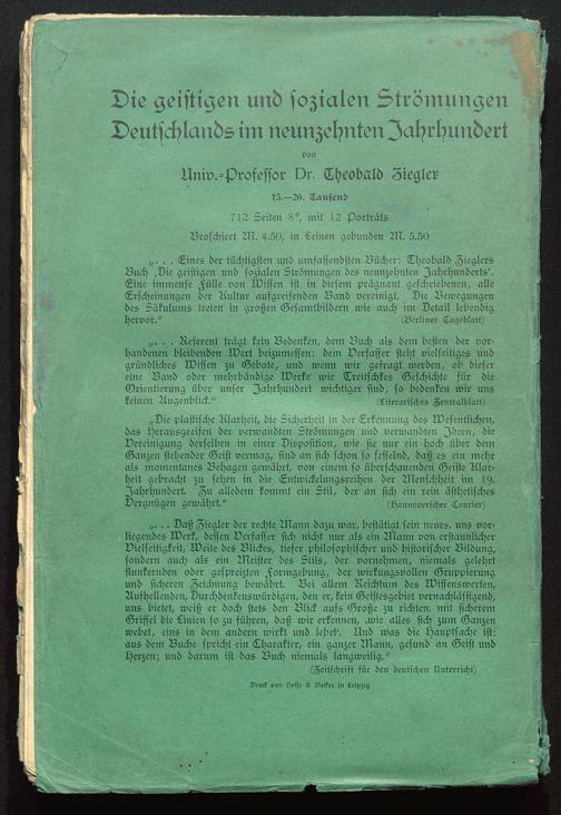 „. . . Lines der tüchtigsten und umfassendsten Bücher: Theobald ZieglersBuch .Die geistigen und sozialen Strömungen des neunzehnten Jahrhunderts'.Line immense Fülle von Wissen ist in diesem prägnant geschriebenen, alleErscheinunzen der Aultur aufgreifenden Band vereinigt. Die Bewegungendes Säkulums treten in großen Gesamtbildern wie auch im Detail lebendighervor." (Berliner Tageblatt)