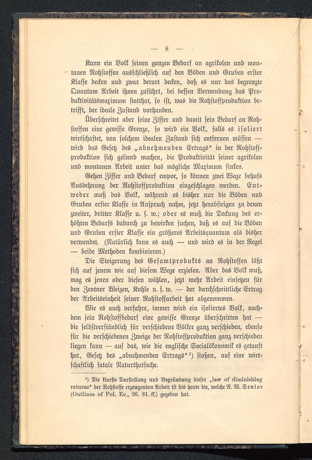 Wie es auch verfahre, immer wird ein isoliertes Volk, nach-dem sein Rohstoffbedarf eine gewisse Grenze überschritten hat —die selbstverständlich für verschiedene Völker ganz verschieden, ebensofür die verschiedenen Zweige der Rohstoffproduktion ganz verschiedenliegen kann — auf das, wie die englische Socialökonomik es getaufthat, Gesetz des „abnehmenden Ertrags'") stoßen, auf eine wirt-schaftlich fatale Naturthatsache.