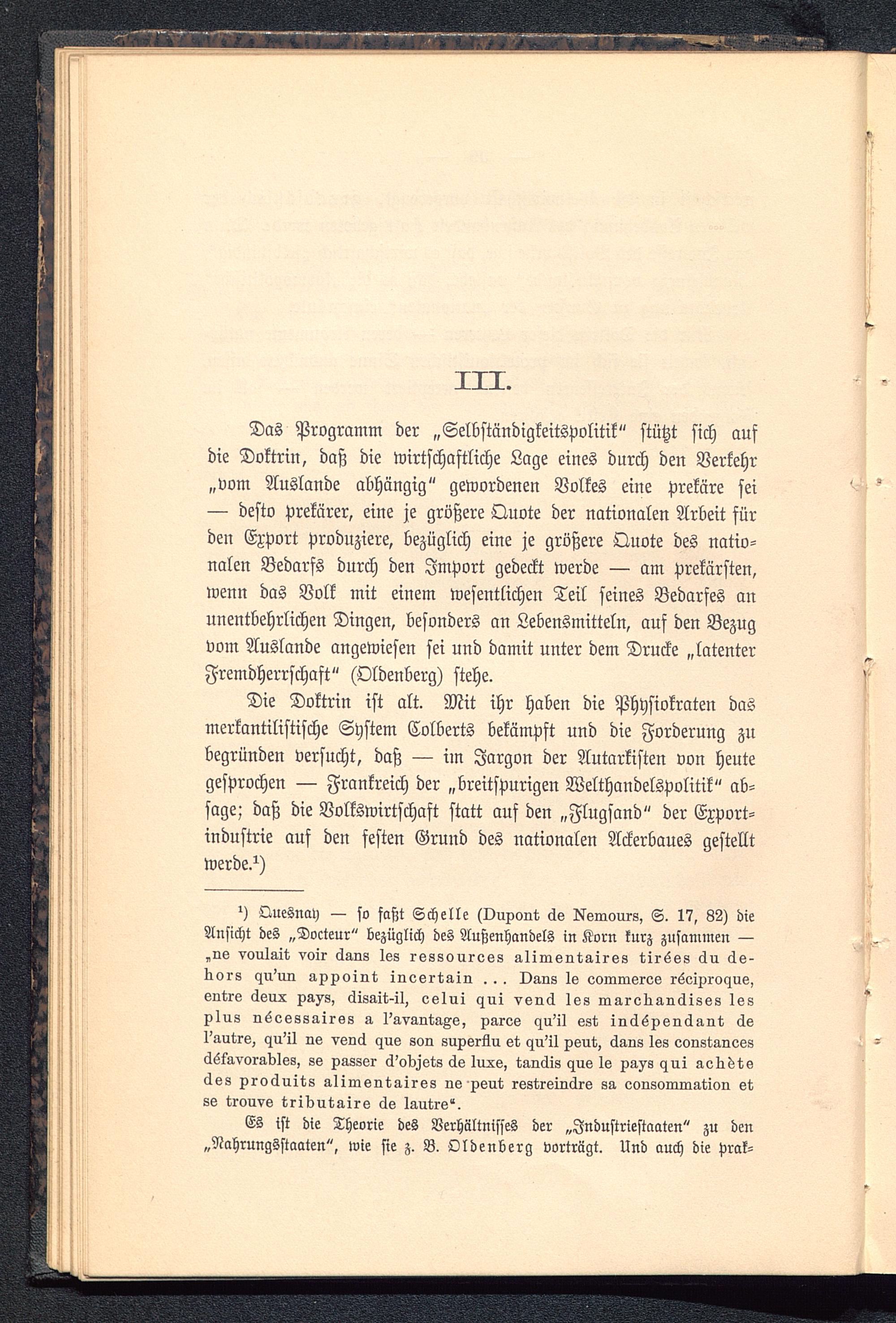 Das Programm der „Selbständigkeitspolitik" stützt sich aufdie Doktrin, daß die wirtschaftliche Lage eines durch den Verkehr„vom Auslande abhängig" gewordenen Volkes eine prekäre sei— desto prekärer, eine je größere Quote der nationalen Arbeit fürden Export produziere, bezüglich eine je größere Quote des natio-nalen Bedarfs durch den Import gedeckt werde — am prekärsten,wenn das Volk mit einem wesentlichen Teil seines Bedarfes anunentbehrlichen Dingen, besonders an Lebensmitteln, auf den Bezugvom Auslande angewiesen sei und damit unter dem Drucke „latenterFremdherrschaft" (Oldenberg) stehe.