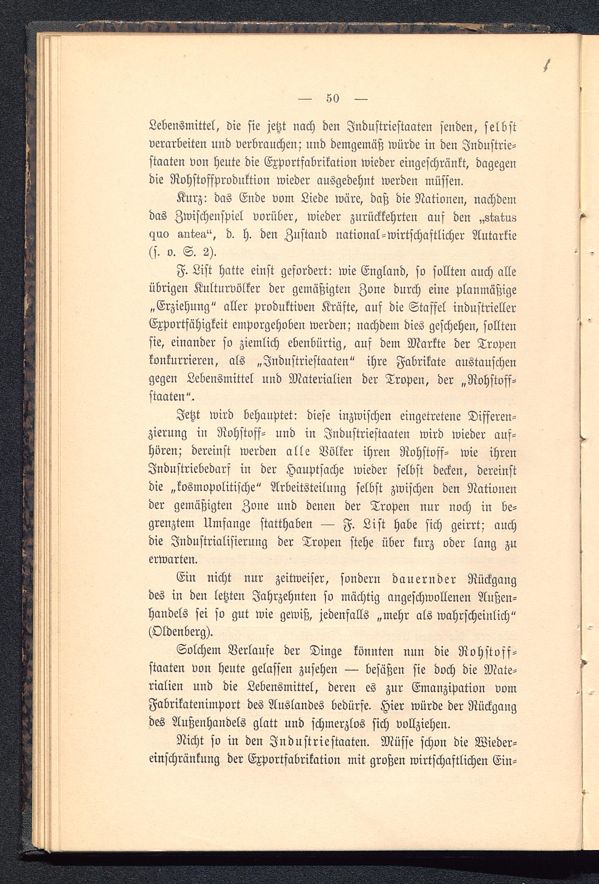 F. List hatte einst gefordert: wie England , so sollten auch alleübrigen Kulturvölker der gemäßigten Zone durch eine planmäßige„Erziehung" aller produktiven Kräfte, auf die Staffel industriellerExportfähigkeit emporgehoben werden; nachdem dies geschehen, solltensie, einander so ziemlich ebenbürtig, auf dem Markte der Tropenkonkurrieren, als „Industriestaaten" ihre Fabrikate austauschengegen Lebensmittel und Materialien der Tropen, der „Rohstosf-staaten".