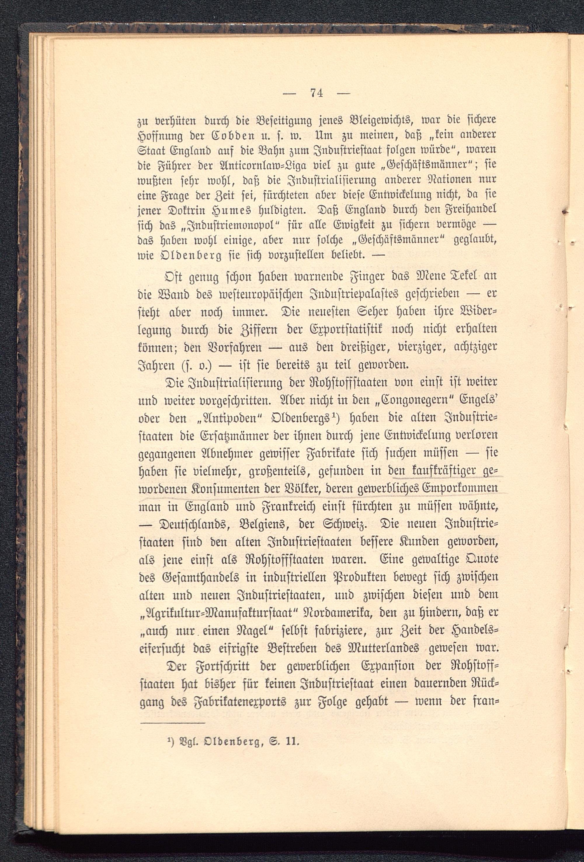 zu verhüten durch die Beseitigung jenes Bleigewichts, war die sichereHoffnung der Cobden u. s. w. Um zu meinen, daß „kein andererStaat England auf die Bahn zum Industriestaat folgen würde", warendie Führer der Anticornlaw-Liga viel zu gute „Geschäftsmänner"; siewußten sehr wohl, daß die Industrialisierung anderer Nationen nureine Frage der Zeit sei, fürchteten aber diese Entwickelung nicht, da siejener Doktrin Humes huldigten. Daß England durch deu Freihandelsich das „Jndustriemonopol" für alle Ewigkeit zu sichern vermöge —das haben wohl einige, aber mir solche „Geschäftsmänner" geglaubt,wie Oldenberg sie sich vorzustellen beliebt. —