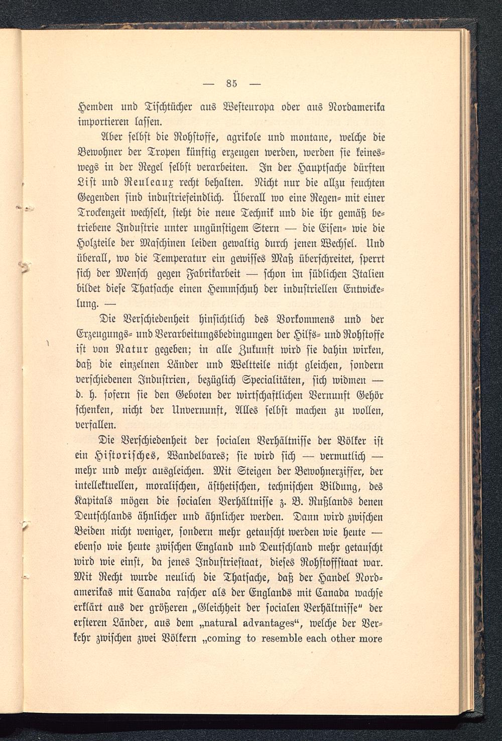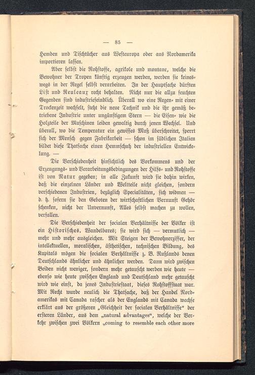 Die Verschiedenheit der socialen Verhältnisse der Völker istein Historisches, Wandelbares; sie wird sich — vermutlich —mehr und mehr ausgleichen. Mit Steigen der Bewohnerziffer, derintellektuellen, moralischen, ästhetischen, technischen Bildung, desKapitals mögen die socialen Verhältnisse z. B. Rußlands denenDeutschlands ähnlicher und ähnlicher werden. Dann wird zwischenBeiden nicht weniger, sondern mehr getauscht werden wie heute —ebenso wie heute zwischen England und Deutschland mehr getauschtwird wie einst, da jenes Industriestaat, dieses Rohstoffstaat war.Mit Recht wurde neulich die Thatsache, daß der Handel Nord-amerikas mit Canada rascher als der Englands mit Canada wachseerklärt aus der größeren „Gleichheit der socialen Verhältnisse" derersteren Länder, aus dem „uaturg,! ^ävant^eZ", welche der Ver-kehr zwischen zwei Völkern „comiiiS tc> rsssradls eaon otksr mors