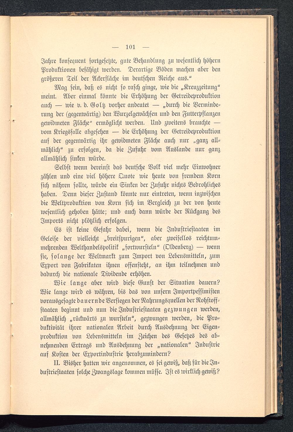 Selbst wenn dereinst das deutsche Volk viel mehr Einwohnerzählen und eine viel höhere Qnote wie heute von fremdem Kornsich nähren sollte, würde ein Sinken der Zufuhr nichts Bedrohlicheshaben. Denn dieser Zustand könnte nur eintreten, wenn inzwischendie Weltproduktion von Korn sich im Vergleich zu der von hentewesentlich gehoben Hütte; und auch dann würde der Rückgang desImports nicht plötzlich erfolgen.