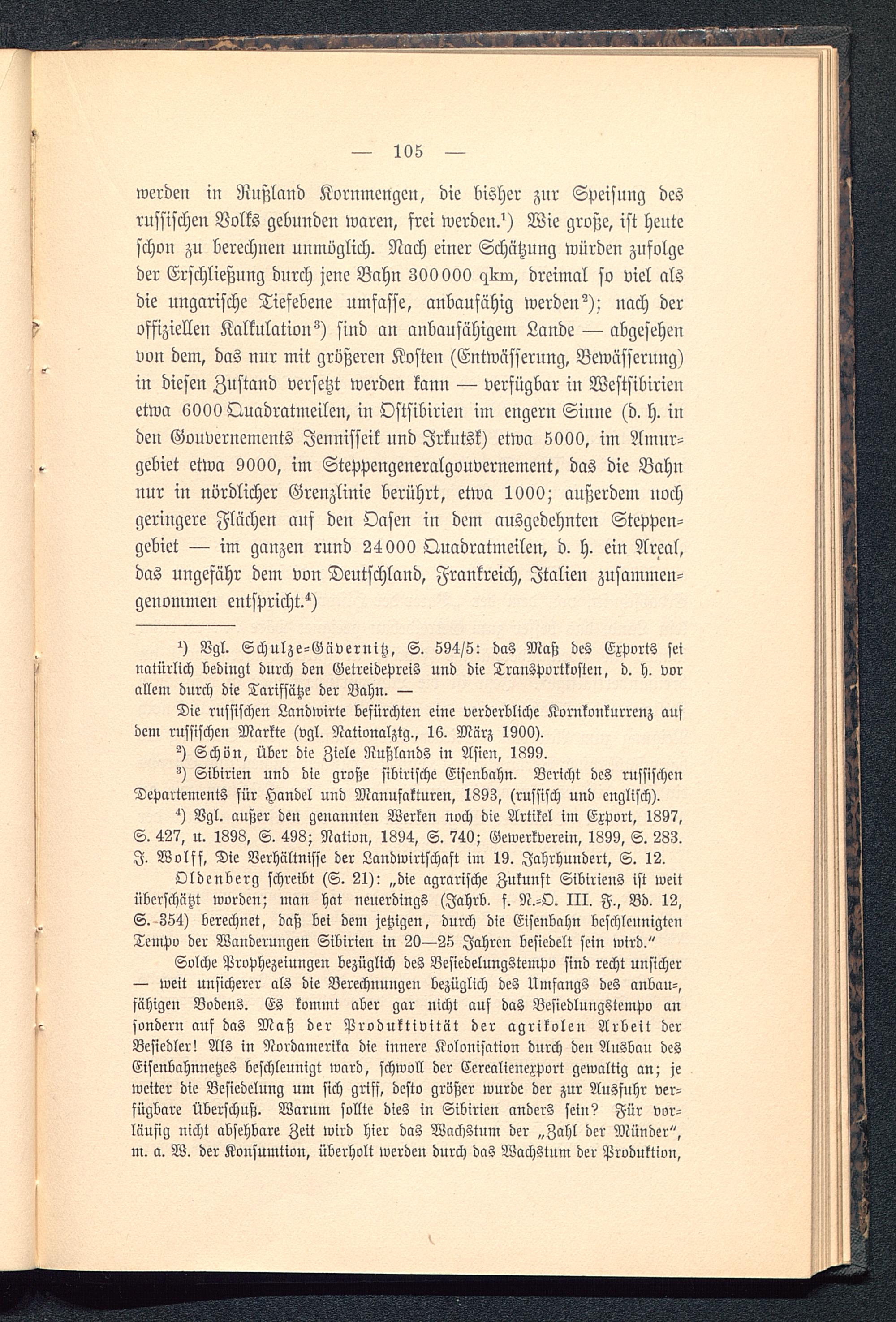 Oldenberg schreibt (S. 21): „die agrarische Zukunft Sibiriens ist weitüberschätzt worden; man hat neuerdings (Jahrb. f. N.-O. III. F., Bd. 12,S. 354) berechnet, daß bei dem jetzigen, durch die Eisenbahn beschleunigtenTempo der Wanderungen Sibirien in 20—25 Jahren besiedelt sein wird."