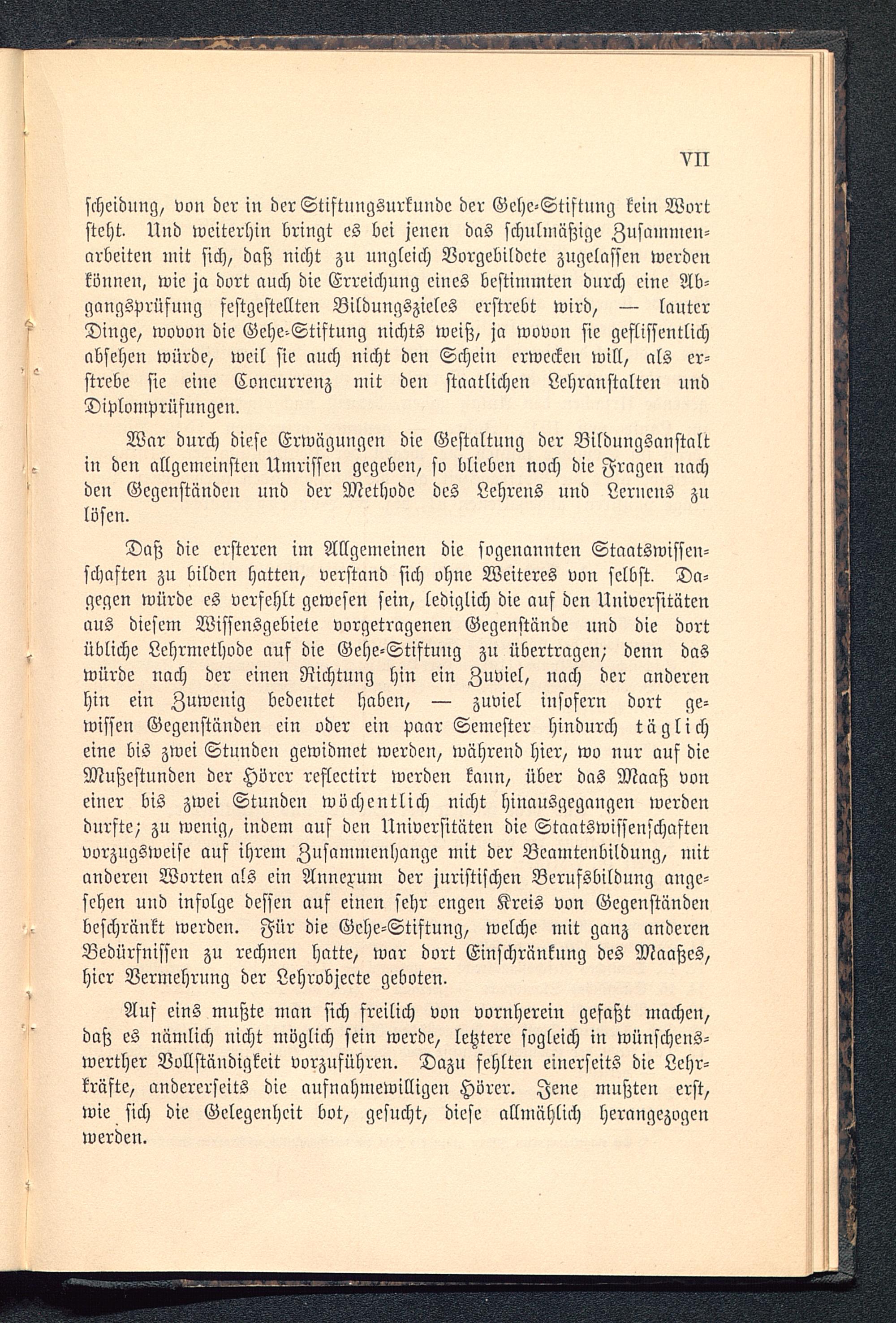 Daß die ersteren im Allgemeinen die sogenannten Staatswissen-schaften zu bilden hatten, verstand sich ohne Weiteres von selbst. Da-gegen würde es verfehlt gewesen sein, lediglich die ans den Universitätenaus diesem Wissensgebiete vorgetragenen Gegenstände und die dortübliche Lehrmethode auf die Gehe-Stiftuug zu übertragen,- denn daswürde uach der einen Richtung hin ein Zuviel, nach der anderenhin ein Zuwenig bedeutet haben, — zuviel insofern dort ge-wissen Gegenständen ein oder ein paar Semester hindurch täglicheine bis zwei Stunden gewidmet werden, während hier, wo nur auf dieMußestunden der Hörer reflectirt werden kann, über das Maaß voneiner bis zwei Stunden wöchentlich nicht hinausgegangen werdendurfte) zu wenig, indem auf den Universitäten die Staatswissenschaftenvorzugsweise auf ihrem Zusammenhange mit der Beamtenbildnng, mitanderen Worten als ein Annexum der juristischen Berufsbildung ange-sehen und infolge dessen auf einen sehr engen Kreis von Gegenständenbeschränkt werden. Für die Gehe-Stiftuug, welche mit ganz anderenBedürfnissen zu rechuen hatte, war dort Einschränkung des Maaßes,hier Vermehrung der Lehrobjecte geboten.