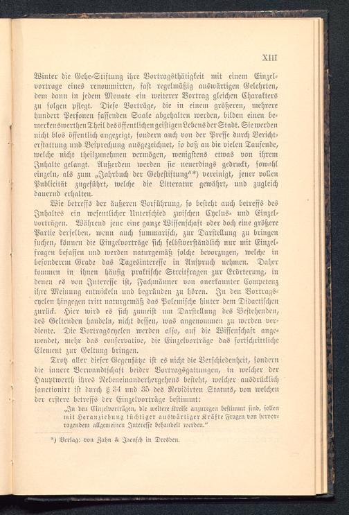 Winter die Gehe-Stiftung ihre Vortragstätigkeit mit einem Einzel-vortrage eines renvmmirten, fast regelmäßig auswärtigen Gelehrten,dein dann in jedem Mvnate ein weiterer Vvrtrag gleichen Charakterszn fvlgen Pflegt. Diese Vorträge, die in einem größeren, mehrerehundert Personen fassenden Saale abgehalten werden, bilden einen be-merkenswerthen Theil des öffentlichen geistigen Lebens der Stadt. Sie werdennicht blos öffentlich angezeigt, sondern auch von der Presse durch Bericht-erstattung und Besprechung ausgezeichnet, so daß au die vielen Tausende,welche uicht theilzunehmeu vermögen, wenigstens etwas von ihremInhalte gelangt. Außerdem werden sie neuerdings gedruckt, sowohleinzeln, als zum „Jahrbuch der Gehestistuug"^) vereinigt, jener vollenPublieität zugeführt, welche die Litteratur gewährt, und zugleichdauernd erhalten.