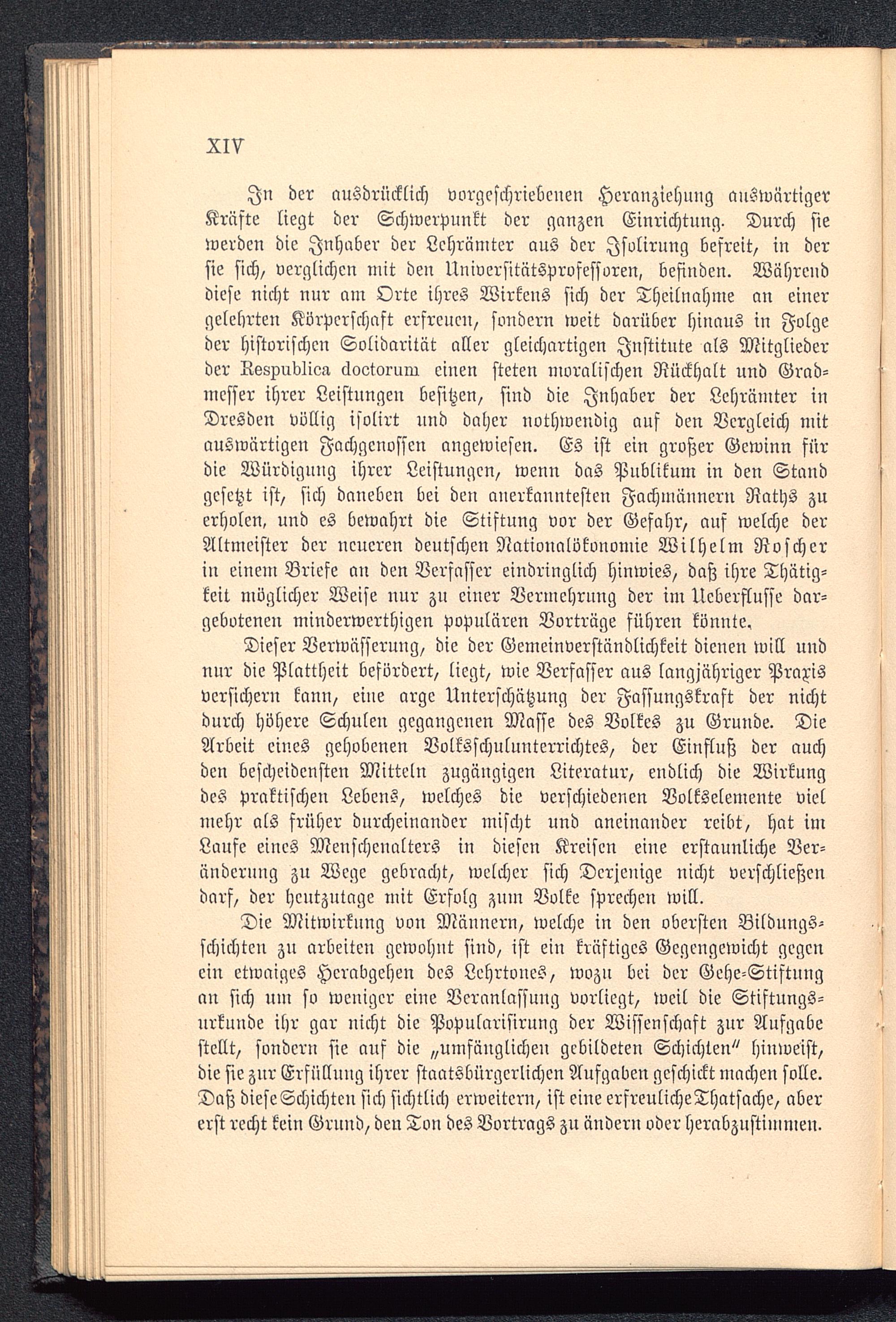In der ausdrücklich vorgeschriebenen Heranziehung auswärtigerKräfte liegt der Schwerpunkt der ganzen Einrichtung. Durch siewerden die Inhaber der Lehrämter aus der Jsolirung befreit, in dersie sich, verglichen mit den Universitätsprvfessoren, befinden. Währenddiese nicht nur am Orte ihres Wirkens sich der Theilnahme an einergelehrten Körperschaft erfreuen, sondern weit darüber hinaus in Folgeder historischen Solidarität aller gleichartigen Institute als Mitgliederder Rsspublieg, ckootorum einen steten moralischen Rückhalt und Grad-messer ihrer Leistungen besitzen, sind die Inhaber der Lehrämter inDresden völlig isolirt uud daher nothwendig ans den Vergleich mitauswärtigen Fachgenossen angewiesen. Es ist ein großer Gewinn fürdie Würdigung ihrer Leistungen, wenn das Pnblikum in den Standgesetzt ist, sich daneben bei den anerkanntesten Fachmännern Raths zuerholen, und es bewahrt die Stiftung vor der Gefahr, auf welche derAltmeister der neueren deutschen Nationalökonomie Wilhelm Röscherin einem Briefe an den Verfasser eindringlich hinwies, daß ihre Thätig-keit möglicher Weise nur zu einer Vermehrung der im Ucberflusse dar-gebotenen minderwertigen populären Vorträge führen könnte.