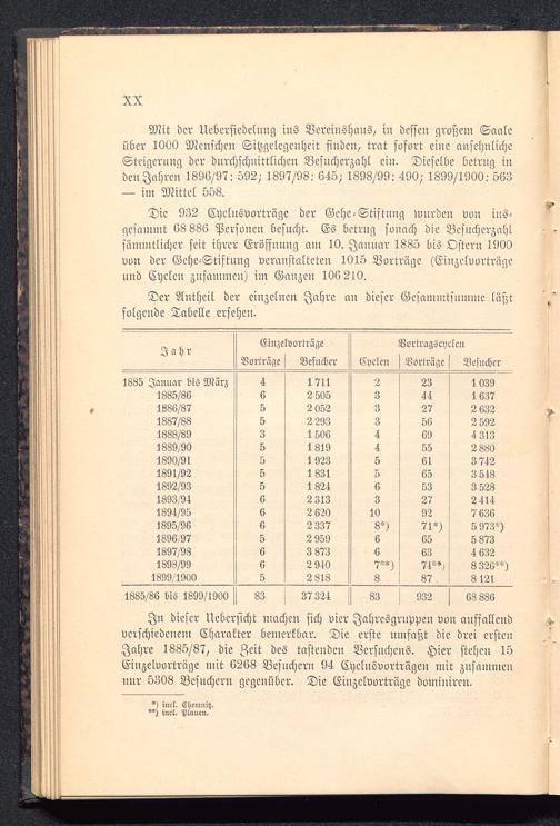 In dieser Uebersicht machen sich vier Jahresgruppen von auffallendverschiedenem Charakter bemerkbar. Die erste umfaßt die drei erstenJahre 1885/87, die Zeit des tastenden Versnchens. Hier stehen 15Einzelvorträge mit 6268 Besuchern 94 Cyelusvvrträgen mit zusammennur 5308 Besuchern gegenüber. Die Einzelvorträge dominiren.
