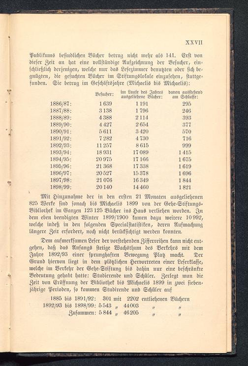 1885 bis 1891/92: 301 mit 2202 entliehenen Büchern1892/93 bis 1898/99: 5 543 „ 44003 „ „Zusammen: 5 844 „ 46205 „ „
