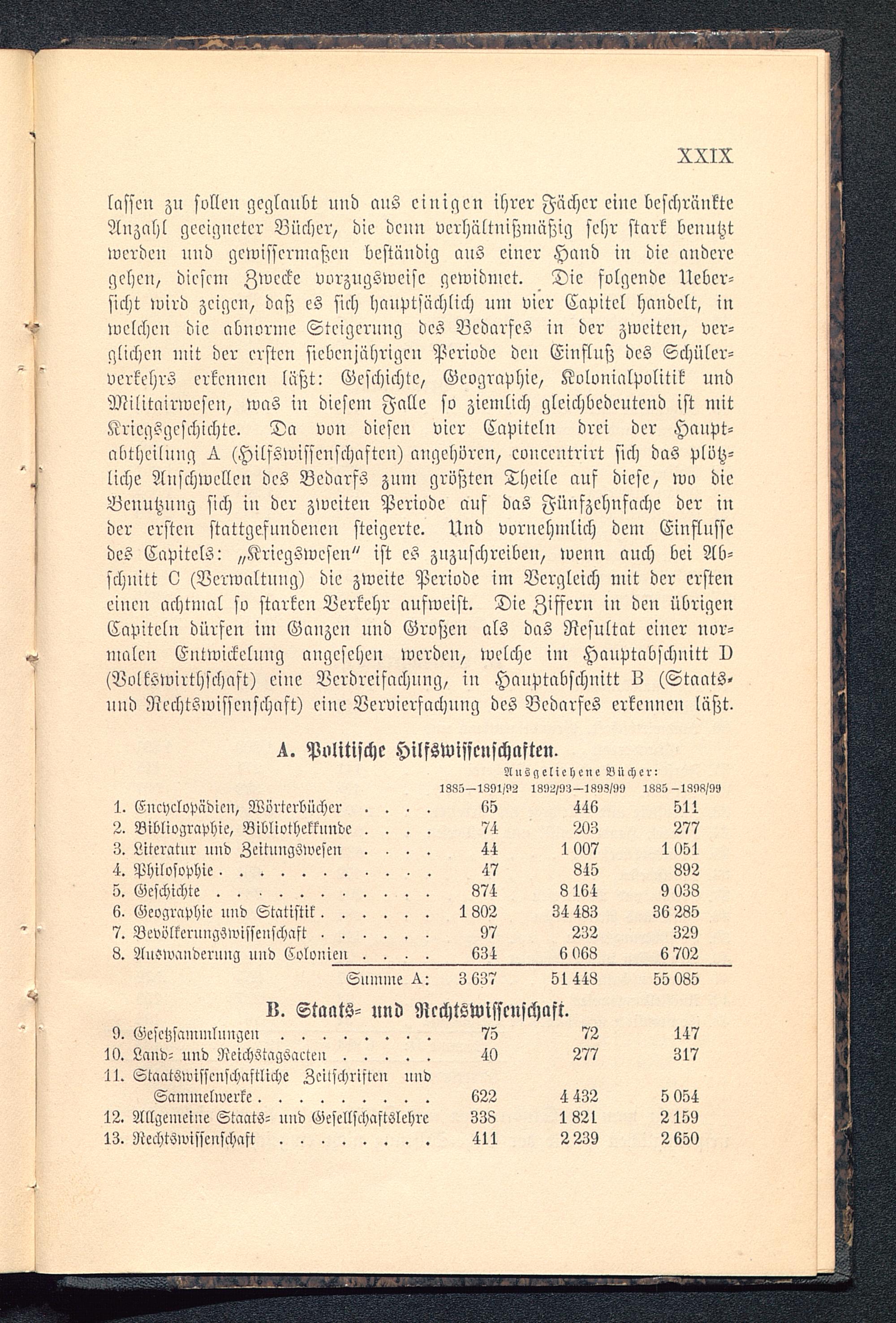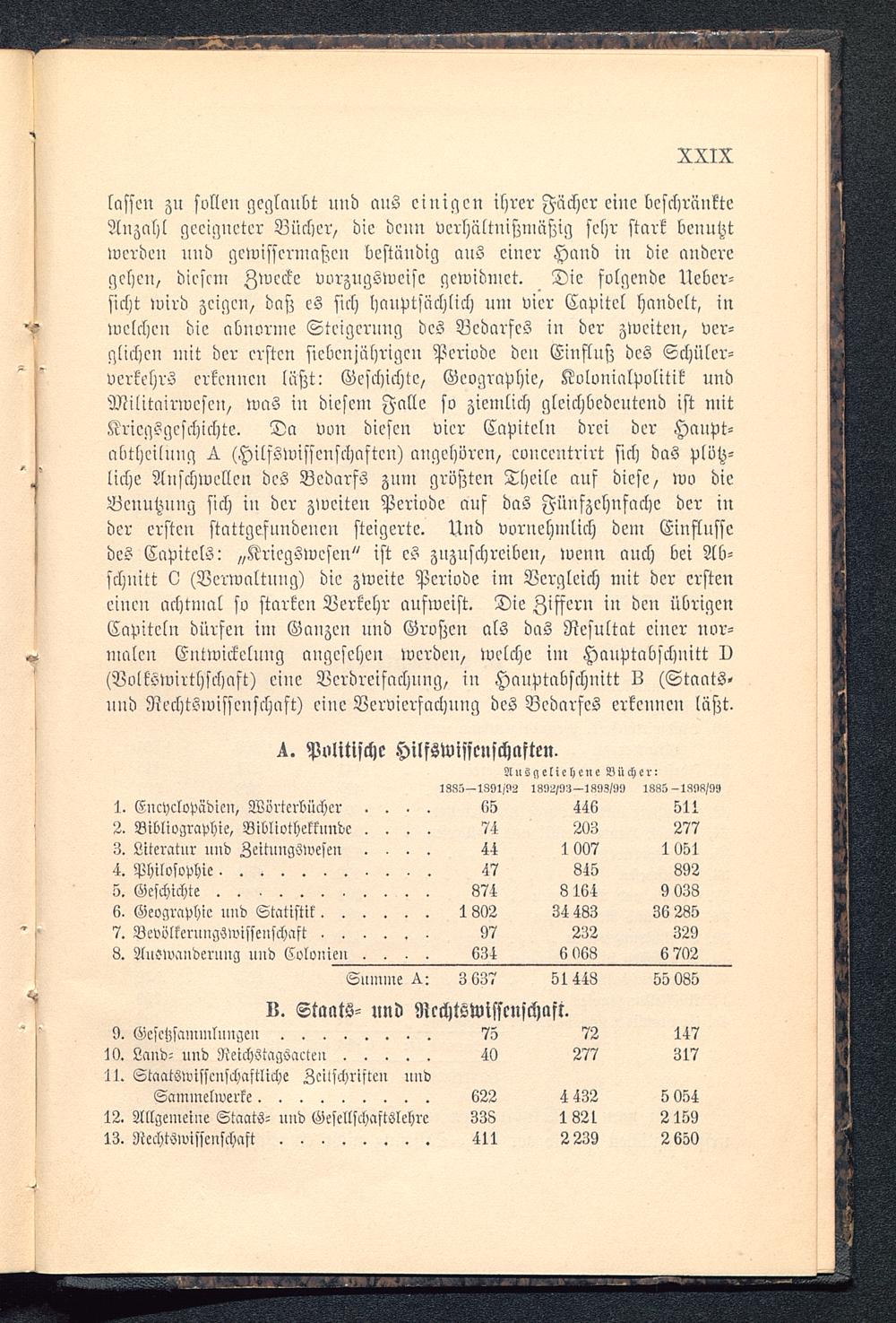 lassen zu sollen geglaubt uud aus ciuigcn ihrer Fächer eiue beschränkteAnzahl geeigneter Bücher, die denn verhältnißmäßig sehr stark benutztwerden uud gewissermaßen beständig aus einer Hand in die anderegehen, diesem Zwecke vorzugsweise gewidmet. Die folgende Ueber-sicht wird zeigen, daß es sich hauptsächlich um vier Capitel handelt, inwelchen die abnorme Steigerung des VcdarseS in der zweiten, ver-glichen mit der ersten siebenjährigen Periode den Einfluß des Schüler-verkehrs erkennen läßt: Geschichte, Geographie, Kolvnialpolitik undMilitnirweseu, was iu diesem Falle so ziemlich gleichbedeutend ist mitKriegsgeschichte. Da von diesen vier Capiteln drei der Haupt-abthciluug L. (Hilfswissenschaften) augehören, cvncentrirt sich das plötz-liche Anschwellen des Bedarfs zum größten Theile auf diese, wo dieBenutzung sich in der zweiten Periode auf das Fünfzehnfache der inder ersten stattgefundenen steigerte. Und vornehmlich dem Einflüssedes Capitels: „Kriegswesen" ist es zuzuschreiben, wenn auch bei Ab-schnitt v (Verwaltung) die zweite Periode im Vergleich mit der ersteneinen achtmal so starken Verkehr aufweist. Die Ziffern in den übrigenCapiteln dürfen im Ganzeu und Großen als das Resultat einer nor-malen Eutwickelnng angesehen werden, welche im Hauptabschnitt D(Volkswirthfchnft) eiue Verdreifachung, iu Hauptabschnitt IZ (Staats-uud Rechtswissenschaft) eine Vervierfachung des Bedarfes erkennen läßt.