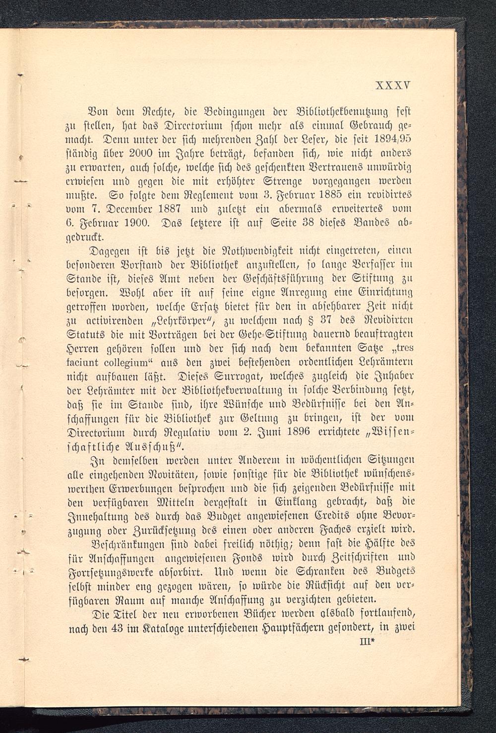 Dagegen ist bis jetzt die Nothwendigkeit nicht eingetreten, eiueubesonderen Vorstand der Bibliothek anzustellen, sv lange Verfasser imStande ist, dieses Amt neben der Geschäftsführung der Stiftung znbesorgen. Wohl aber ist anf seine eigue Anregung eine Einrichtunggetroffen worden, welche Ersatz bietet für den iu absehbarer Zeit uichtzu nctivirendcn „Lehrkörper", zu welchem nach Z 37 des RevidirtcnStatuts die mit Vorträgen bei der Gehe-Stiftuug daucrud beauftragtenHerren gehören sollen und der sich nach dem bekannten Satze „trc-Ltaeiunt eollsAium" ans den zwei bestehenden ordentlichen Lehrämternnicht aufbauen läßt. Dieses Surrogat, welches zugleich die Inhaberder Lehrämter mir der Bibliothekverwaltung in solche Verbindung setzt,daß sie im Staude sind, ihre Wünsche uud Bedürfuisse bei den An-schaffungen für die Bibliothek zur Geltung zu bringen, ist der vomDircetorium durch Regulativ vom 2. Juni 1896 errichtete „Wissen-schaftliche Ausschnß".