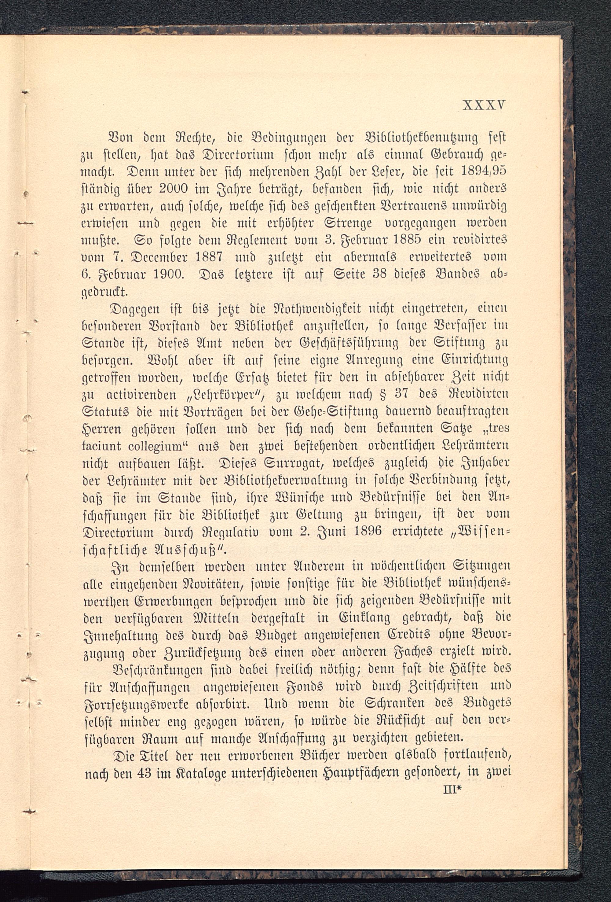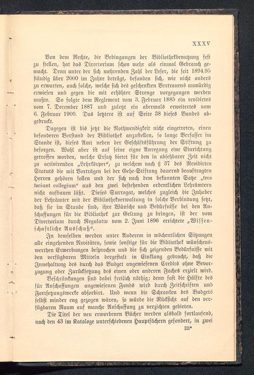 Vvn dem Rechte, die Bedingungen der Biblivthckbcnutzung festzu stellen, hat das Dircetorium schvn mehr als einmal Gebrauch ge-macht. Denn unter der sich mehrenden Zahl der Leser, die seit 1894,95ständig über 2000 im Jahre beträgt, befanden sich, wie nicht anderszu erwarten, auch solche, welche sich des geschenkten Vertraucus unwürdigerwiesen und gegen die mit erhöhter Streugc vorgegangen werdenmußte. Sv fvlgtc dein Reglement vom 3. Fcbrnar 1885 ein rcvidirtesvom 7. December 1887 nud zuletzt eiu abermals erweitertes vom6. Februar 1900. Das letztere ist auf Seite 38 dieses Baudcs ab-gedruckt.