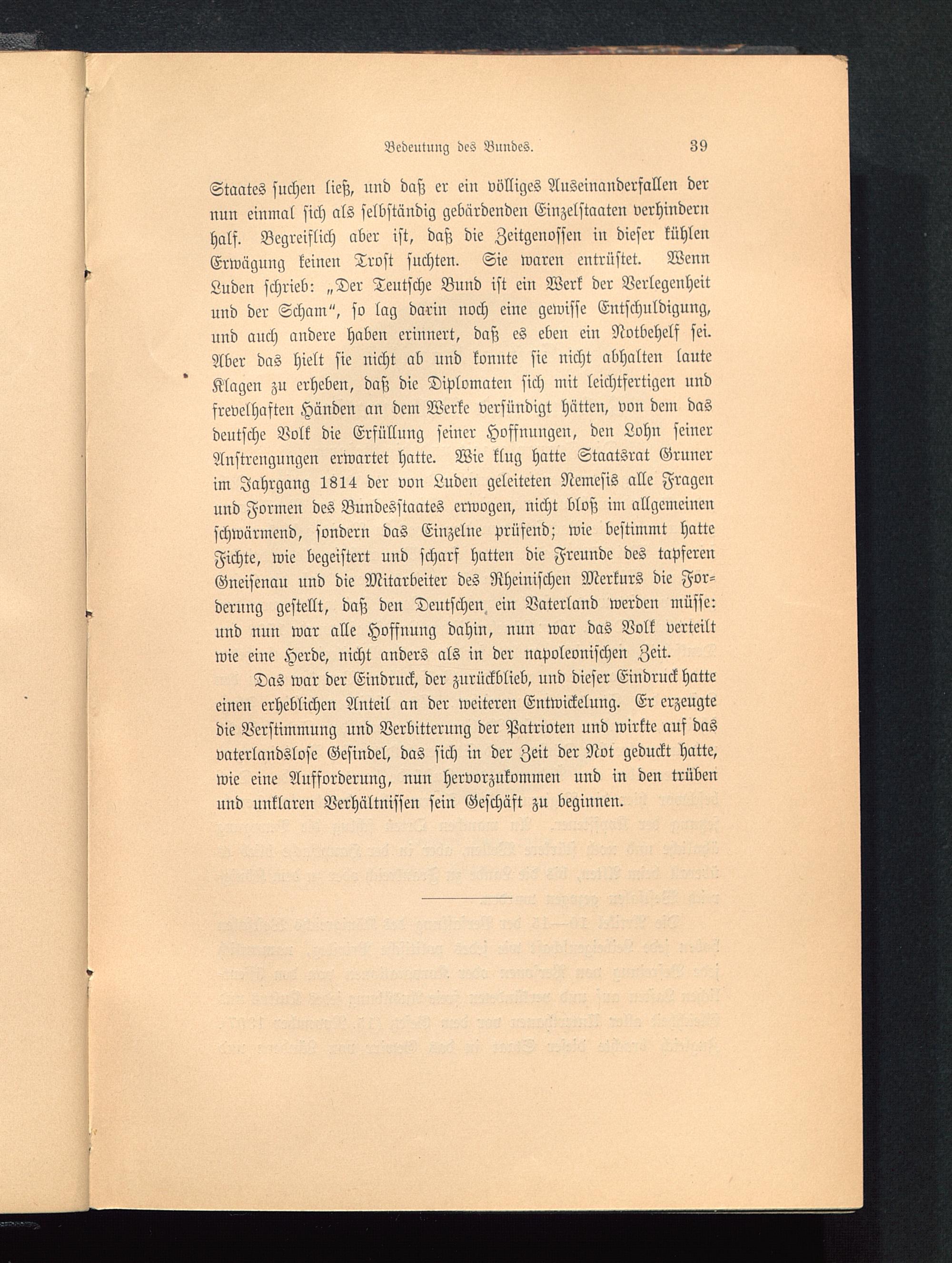 Staates suchen ließ, und daß er ein völliges Auseinanderfallen dernun einmal sich als selbständig gebärdenden Einzelstaaten verhindernhalf. Begreiflich aber ist, daß die Zeitgenossen in dieser kühlenErwägung keinen Trost suchten. Sie waren entrüstet. WennLuden schrieb: „Der Teutsche Bund ist ein Werk der Verlegenheitund der Scham", so lag darin noch eine gewisse Entschuldigung,und auch andere haben erinnert, daß es eben ein Notbehelf sei.Aber das hielt sie nicht ab und konnte sie nicht abhalten lauteKlagen zu erheben, daß die Diplomaten sich mit leichtfertigen nndfrevelhaften Händen an dem Werke versündigt hätten, von dem dasdeutsche Volk die Erfüllung seiner Hoffnungen, den Lohn seinerAnstrengungen erwartet hatte. Wie klug hatte Staatsrat Grünerim Jahrgang 1814 der von Luden geleiteten Nemesis alle Fragenund Formen des Bundesstaates erwogen, nicht bloß im allgemeinenschwärmend, sondern das Einzelne prüfend; wie bestimmt hatteFichte, wie begeistert und scharf hatten die Freunde des tapferenGneisenau und die Mitarbeiter des Rheinischen Merkurs die For-derung gestellt, daß den Deutschen , ein Vaterland werden müsse:und nun war alle Hoffnung dahin, nun war das Volk verteiltwie eine Herde, nicht anders als in der napoleonischen Zeit.
