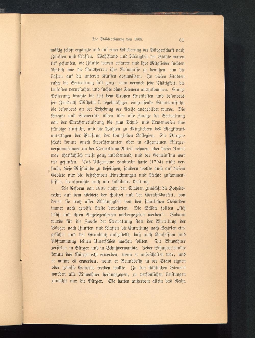 Die Reform von 1808 nahm den Städten zunächst die Hoheits-rechte auf dem Gebiete der Polizei und der Gerichtsbarkeit, vondenen sie trotz aller Abhängigkeit von den staatlichen Behördenimmer noch gewisse Reste bewahrten. Die Städte sollten „sichselbst und ihren Angelegenheiten wiedergegeben werden". Sodannwurde für die Zwecke der Verwaltung statt der Einteiluug derBürger nach Zünften und Klassen die Einteilung nach Bezirken ein-geführt und der Grundsatz aufgestellt, daß auch Konfession undAbstammung keinen Unterschied machen sollten. Die Einwohnerzerfielen in Bürger und in Schutzverwandte. Jeder Schutzverwandtekonnte das Bürgerrecht erwerben, wenn er unbescholten war, under mußte es erwerben, wenn er Grundbesitz in der Stadt eignenoder gewisse Gewerbe treiben wollte. Zu den städtischen Steuernwurden alle Einwohner herangezogen, zu persönlichen Leistungenzunächst nur die Bürger. Sie hatten außerdem allein das Recht,