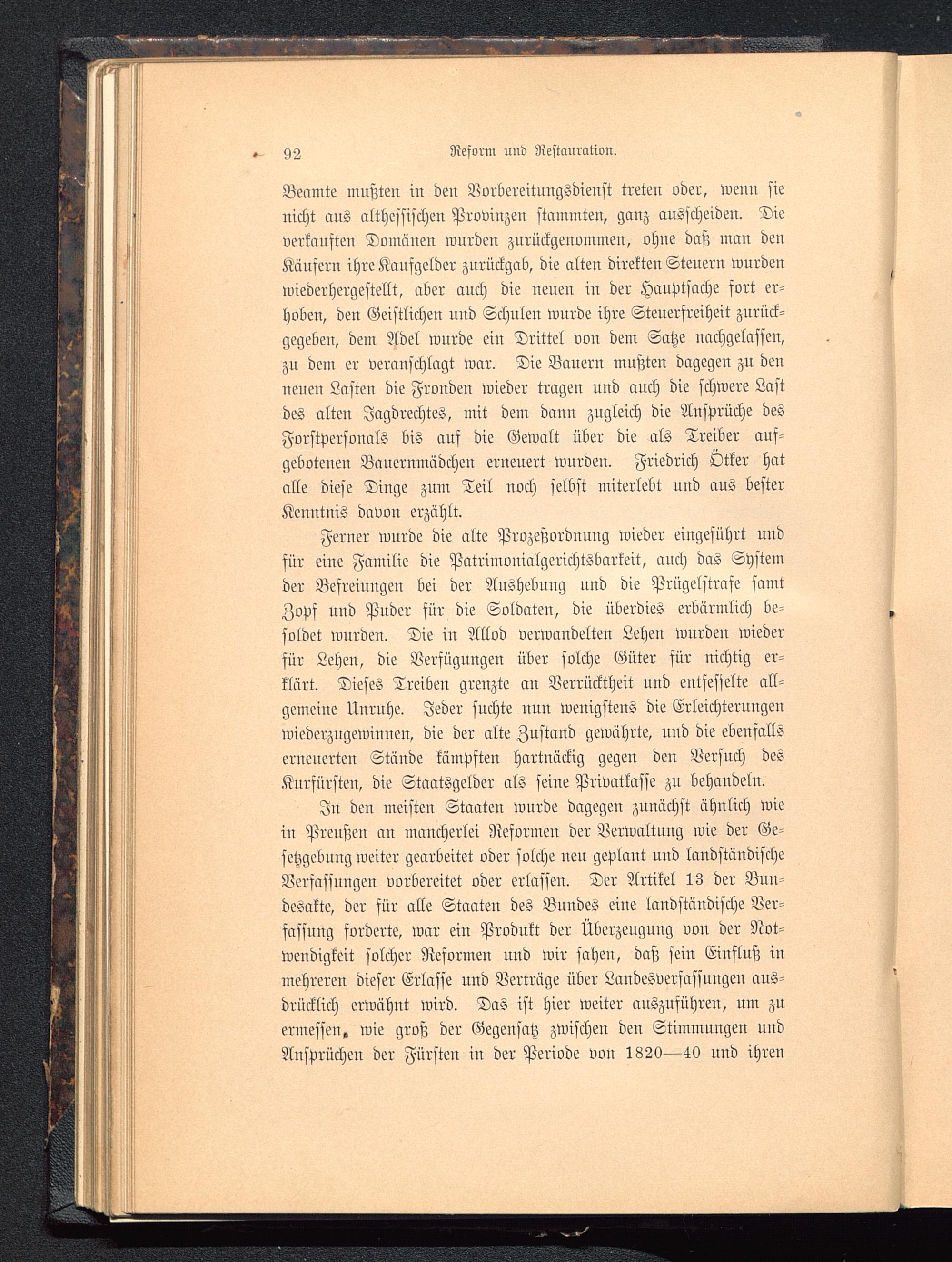 In den meisten Staaten wurde dagegen zunächst ähnlich wiein Prenßen an mancherlei Reformen der Verwaltnng wie der Ge-setzgebung weiter gearbeitet oder solche ueu geplant und landständischeVersassungen vorbereitet oder erlassen. Der Artikel 13 der Buu-desakte, der für alle Staaten des Bundes eine landständische Ver-fassung forderte, war ein Produkt der Überzeugung von der Not-wendigkeit solcher Reformen nnd wir sahen, daß sein Einfluß inmehreren dieser Erlasse und Verträge über Landesverfassungen aus-drücklich erwähut wird. Das ist hier weiter auszuführen, um zuermesseu» wie groß der Gegensatz zwischen den Stimmungen undAnsprüchen der Fürsten in der Periode vvn 1820—40 und ihren