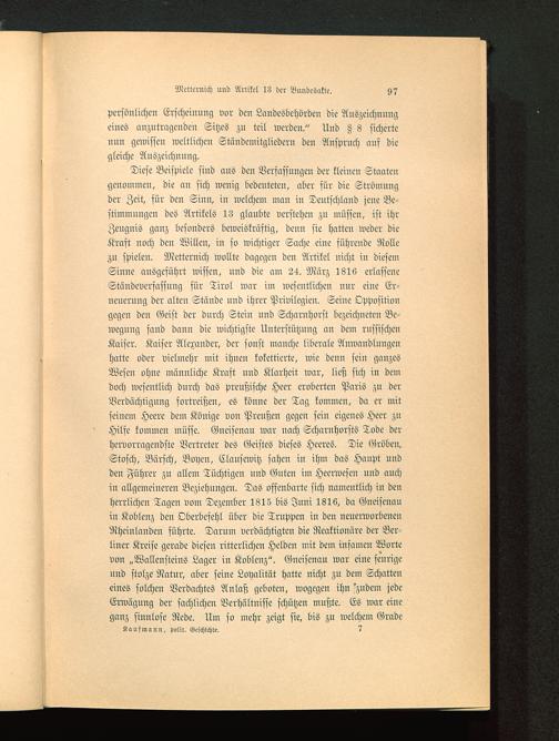 Diese Beispiele sind aus den Versassungen der kleinen Staatengenommen, die an sich wenig bedeuteten, aber sür die Strömungder Zeit, sür den Sinn, in welchem man in Deutschland jene Be-stimmungen des Artikels 13 glaubte verstehen zu müssen, ist ihrZeugnis ganz besonders beweiskräftig, denn sie hatten weder dieKraft noch den Willen, in so wichtiger Sache eine führende Rollezu spielen. Metternich wollte dagegen den Artikel nicht in diesemSinne ausgeführt wissen, und die am 24. März 1816 erlasseneStändeverfassung für Tirol war im wesentlichen nur eine Er-neuerung der alten Stände und ihrer Privilegien. Seine Oppositiongegen den Geist der durch Stein und Scharnhorst bezeichneten Be-wegung fand dann die wichtigste Unterstützung an dem russischenKaiser. Kaiser Alexander, der sonst manche liberale Anwandlungenhatte oder vielmehr mit ihnen kokettierte, wie denn sein ganzesWesen ohne männliche Kraft und Klarheit war, ließ sich in deindoch wesentlich durch das preußische Heer eroberten Paris zu derVerdächtigung fortreißen, es könne der Tag kommen, da er mitseinem Heere dem Könige von Preußen gegen sein eigenes Heer zuHilfe kommen müsfe. Gneisenan war nach Scharnhorsts Tode derhervorragendste Vertreter des Geistes dieses Heeres. Die Grüben,Stosch, Värsch, Boyen, Clausewitz sahen in ihm das Haupt undden Führer zu allem Tüchtigen und Guten im Heerwesen und auchin allgemeineren Beziehungen. Das offenbarte sich namentlich in denherrlichen Tagen vom Dezember 181S bis Juni 1316, da Gneisenauin Koblenz den Oberbefehl über die Truppen in den neuerworbenenRheinlanden führte. Darum verdächtigten die Reaktionäre der Ber-liner Kreise gerade diesen ritterlichen Helden mit dem insamen Worteuon „Wallensteins Lager in Koblenz". Gneisenau war eine seurigeund stolze Natur, aber seine Loyalität hatte nicht zu dem Schatteneines solchen Verdachtes Anlaß geboten, wogegen ihn "zudem jedeErwägung der sachlichen Verhältnisse schützen mußte. Es war eineganz sinnlose Rede. Um so mehr zeigt sie, bis zu welchem Grade