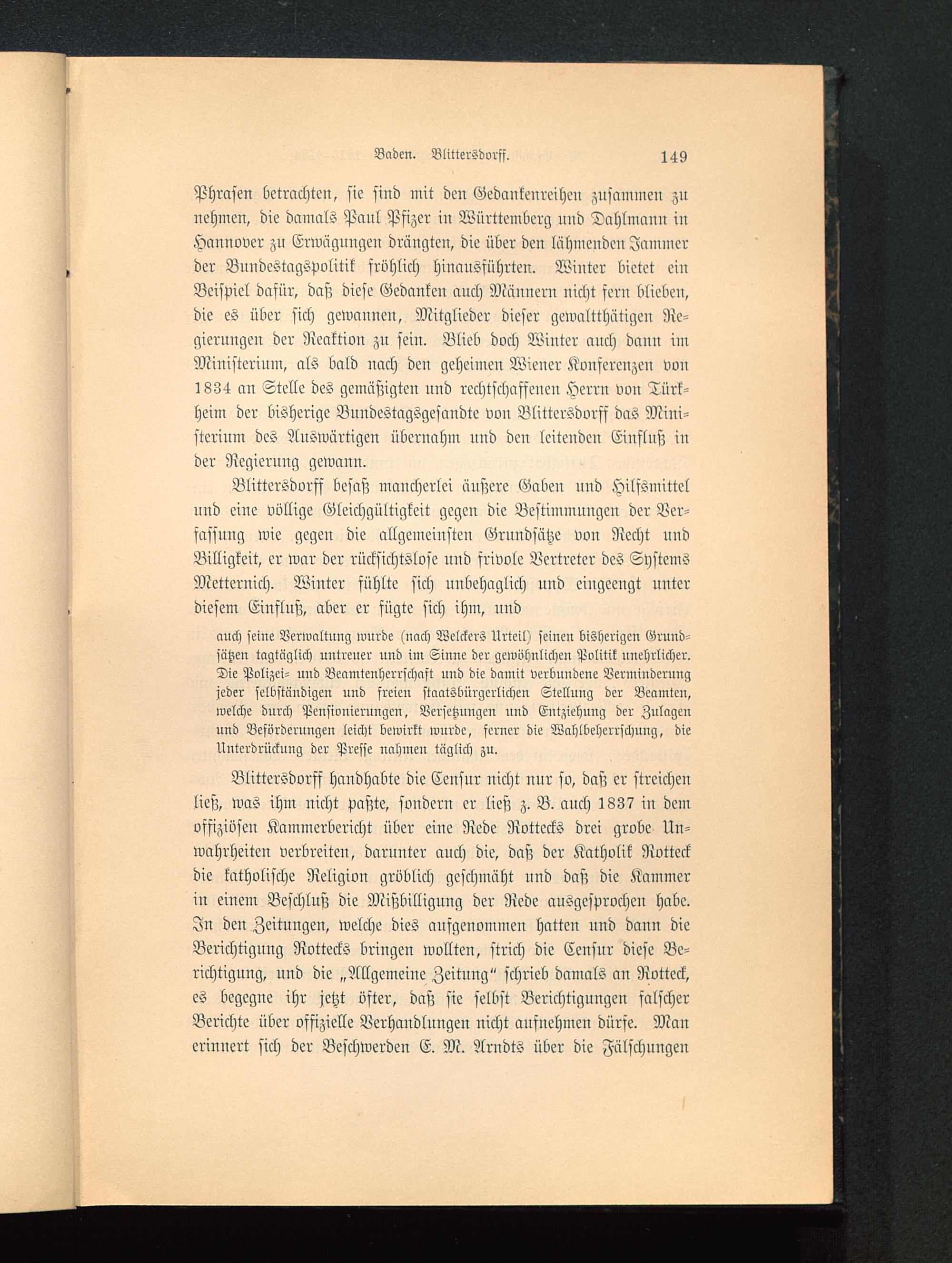 Blittersdvrff handhabte die Censur nicht nur so, daß er streichenließ, was ihm nicht paßte, sondern er ließ z. B. auch 1837 in demoffiziösen Kammcrbericht über eine Rede Rottecks drei grobe Un-wahrheiten verbreiten, darunter auch die, daß der Katholik Rotteckdie katholische Religion gröblich geschmäht und daß die Kammerin einem Beschluß die Mißbilligung der Rede ausgesprochen habe.In deu Zeitungen, welche dies aufgenommen hatten und dann dieBerichtigung Rottecks bringen wollten, strich die Ccnsnr diese Be-richtigung, und die „Allgemeine Zeitnng" schrieb damals an Rotteck,es begegne ihr jetzt öfter, daß sie selbst Berichtigungen snlschcrBerichte über offizielle Verhandlungen nicht aufnehmen dürfe. Manerinnert sich der Beschwerden E. M. Arndts über die Fälschungen