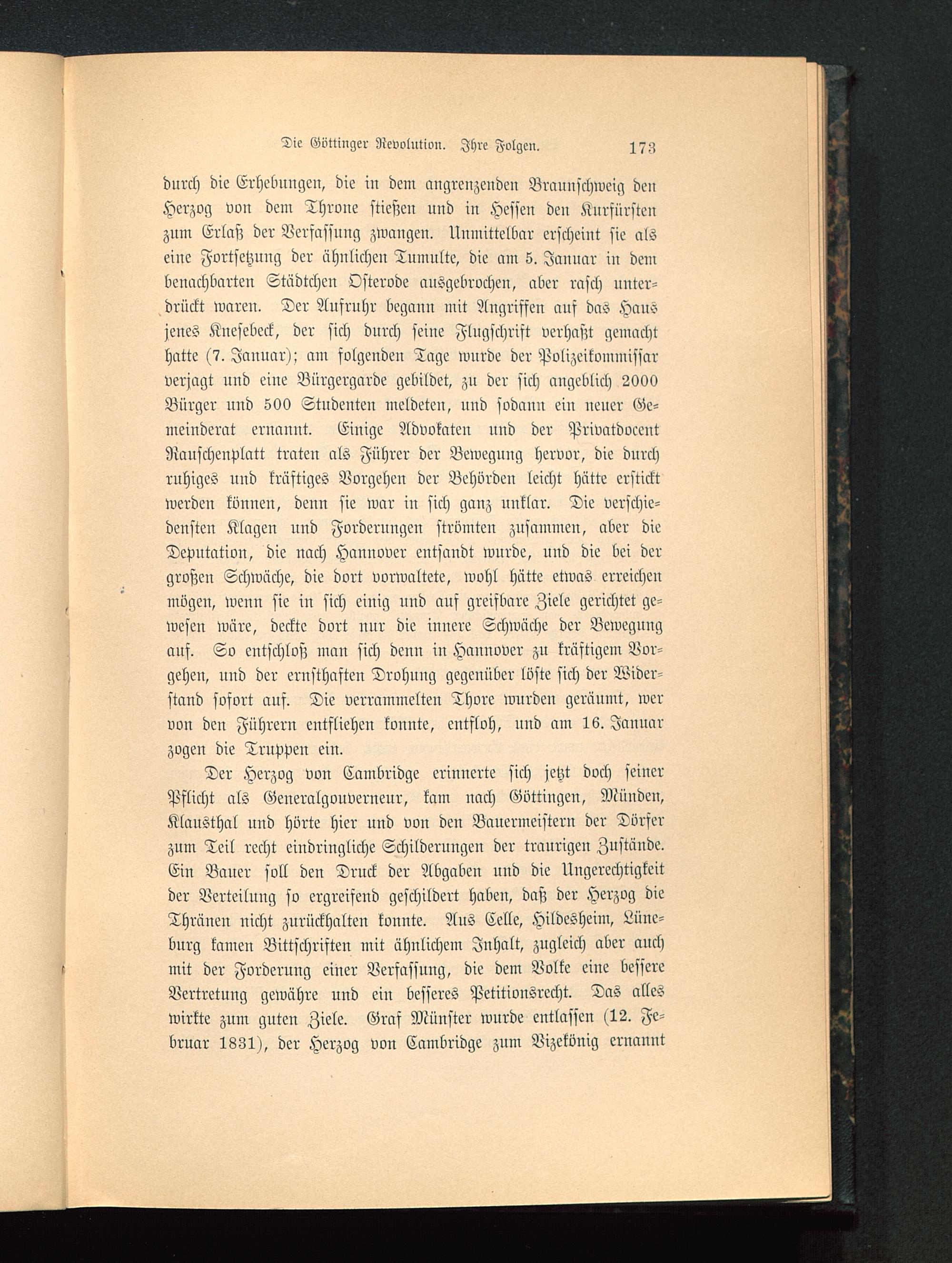 durch die Erhebungen, die in dem angrenzenden Braunschweig denHerzog von dem Throne stießen uud iu Hessen den Kurfürstenzum Erlaß der Verfassung zwaugen. Unmittelbar erscheint sie alseine Fortsetzung der ähnlichen Tumulte, die am ö. Januar in dembenachbarten Städtchen Osterode ausgebrochen, aber rasch unter-drückt waren. Der Aufruhr begann mit Angriffen auf das HauSjenes Knesebeck , der sich durch seiue Flugschrist verhaßt gemachthatte (7. Januar)i am folgenden Tage wurde der Polizeikommissarverjagt und eine Bürgergarde gebildet, zu der sich angeblich 2000Bürger und 500 Studenten meldeten, und sodann ein neuer Ge-mcinderat eruanut. Einige Advokaten und der PrivatdoeeutRauschenplatt traten als Führer der Bewegung hervor, die durchruhiges und kräftiges Vorgehen der Behörden leicht hätte ersticktwerden können, denn sie war in fich ganz unklar. Die verschie-densten Klagen und Forderungen strömten zusammen, aber dieDeputation, die nach Hannover entsandt wnrde, nnd die bei dergroßen Schwäche, die dort vorwaltete, Wohl hätte etwas erreichenmögen, wenn sie in sich einig und auf greifbare Ziele gerichtet ge-wesen wäre, deckte dort nnr die innere Schwäche der Bewegungauf. So entschloß man sich denn in Hannover zu krästigem Vor-gehen, und der ernsthaften Drohung gegenüber löste sich der Wider-stand sofort auf. Die verrammelten Thore wurden geränmt, wervon den Führern entfliehen konnte, entfloh, und am 16. Januarzogen die Truppen ein.