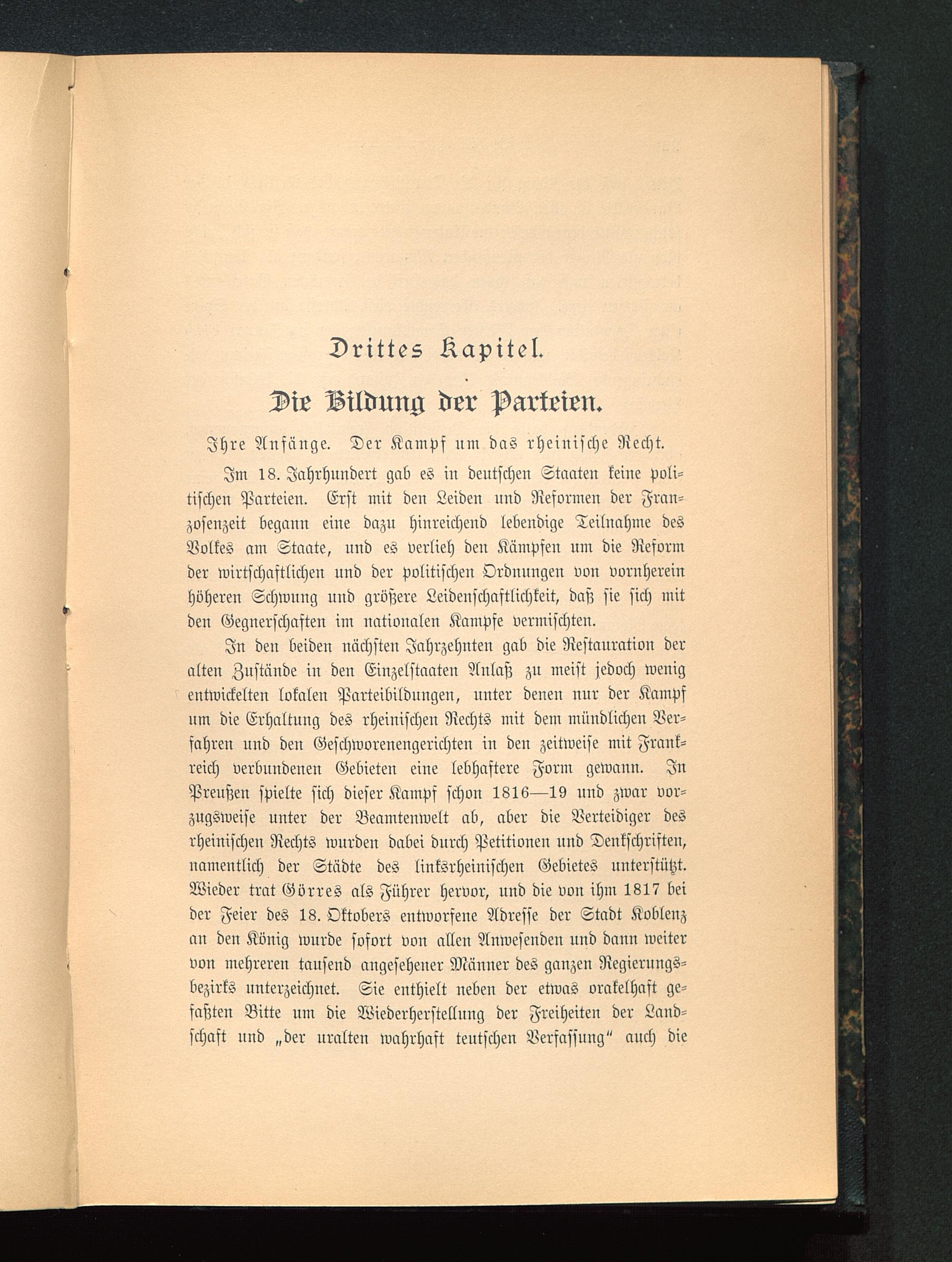 In den beiden nächsten Jahrzehnten gab die Nestanration deralten Zustände in den Einzelstnaten Anlaß zu meist jedoch wenigentwickelten lokaleu Parteibilduugen, unter denen nur der Kampfum die Erhaltung des rheinischen Rechts mit dem mündlichen Ver-fahren und den Geschworenengerichten in den zeitweise mit Frank-reich verbundenen Gebieteu eine lebhaftere Form gewann. InPreußen spielte sich dieser Kampf schon 1816—19 und zwar vor-zugsweise unter der Beamtenwelt ab, aber die Verteidiger desrheinischen Rechts wurden dabei durch Petitionen und Denkschriften,namentlich der Städte des linksrheinischen Gebietes unterstützt.Wieder trat Görres als Führer hervor, und die von ihm 1817 beider Feier des 18. Oktobers entworfene Adresse der Stadt Koblenzan den König wurde sofort von allen Anwesenden und dann weitervon mehreren tausend angesehener Männer des ganzen Regierungs-bezirks unterzeichnet. Sie enthielt neben der etwas orakelhaft ge-faßten Bitte um die Wiederherstellung der Freiheiten der Laud-schaft uud „der uralteu wahrhaft teutschen Verfassung" auch die
