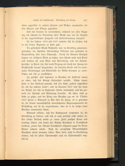 Zu gleicher Zeit begannen in Preußen die Hofkreise davonzu reden, daß des Königs Gesundheit verfalle. Schon immerhatte er den Eindruck gemacht, daß sein Kopf „anders organisiertsei, als der anderer Leute", und im Sommer 1857 traf ihn dannein Anfall, der sich im September stärker wiederholte und ihn zeit-weise der Sprache und Besinnung beraubte. Es schien rasch zuEnde zu gehen, nnd der Prinz von Preußen zog am 19. Oktober1857 Herrn v. Bismarck zu Rat über- die Frage, ob er gebuudensei, bei seinem voraussichtlich bevorstehenden Regierungsantritt dieVersassung, wie sie sei, anzuerkennen, oder ob er sie vorher einerRevision unterwerfen könne.