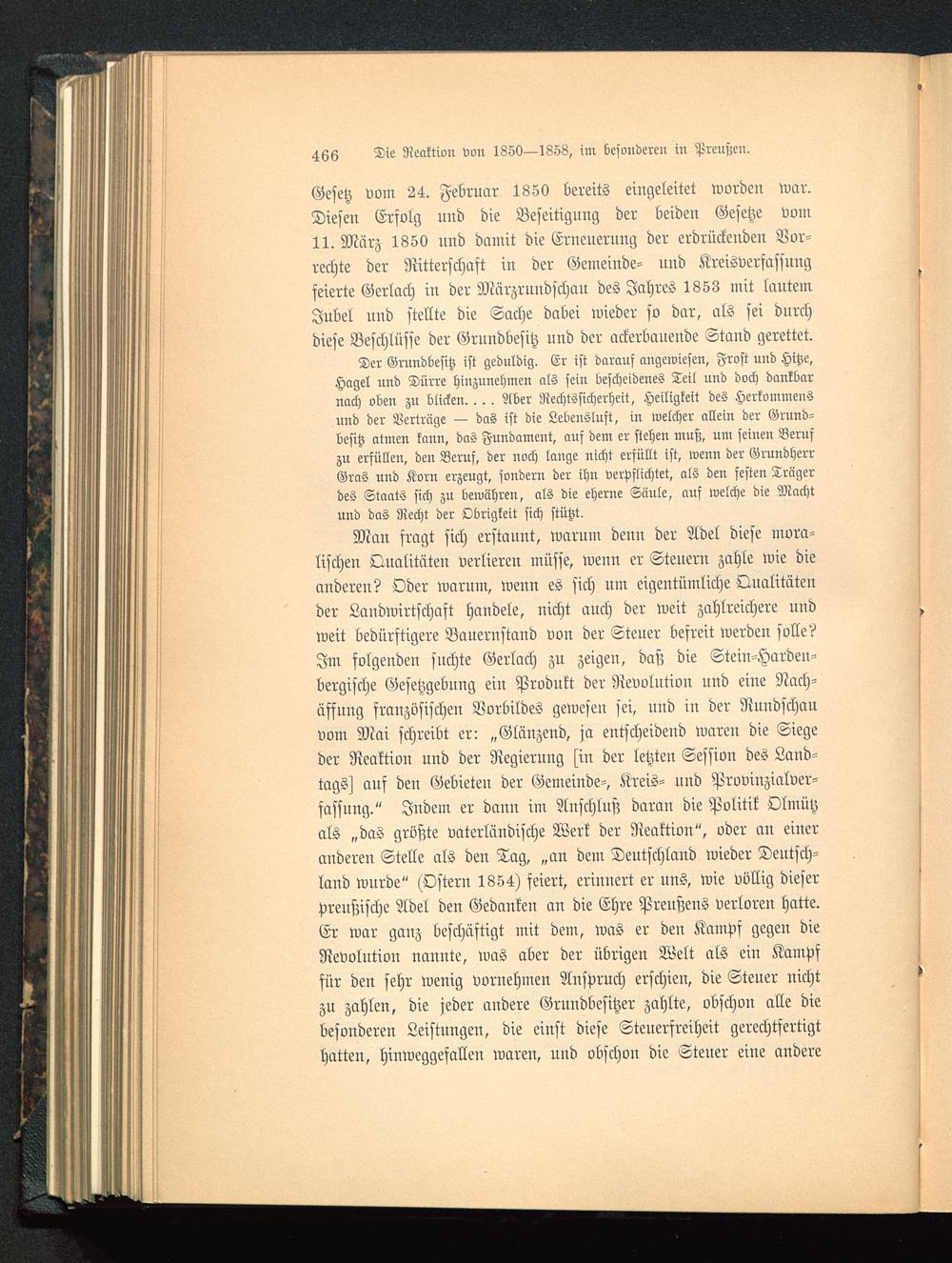 Gesetz vom 24. Februar 1850 bereits eingeleitet worden war.Diesen Erfolg und die Beseitigung der beiden Gesetze vom11. März 1850 und damit die Erneuerung der erdrückenden Vor-rechte der Ritterschaft in der Gemeinde- und Kreisverfassungfeierte Gerlach in der Märzruudschau des Jahres 1853 mit lautemJubel und stellte die Sache dabei wieder so dar, als sei durchdiese Beschlüsse der Grundbesitz und der ackerbauende Stand gerettet.Der Grundbesitz ist geduldig. Er ist darauf augewiesen, Frost uud Hitze,Hagel und Dürre hinzunehmen als sein bescheidenes Teil und doch dankbarnach oben zu blicken. . . . Aber Rechtssicherheit, Heiligkeit des Herkommensund der Verträge — das ist die Lebenslust, in welcher allein der Grund-besitz atmen kann, das Fundament, auf dem er stehen muß, um seinen Berufzu erfüllen, den Beruf, der noch lange nicht erfüllt ist, wenn der GrundherrGras und Korn erzeugt, sondern der ihn verpflichtet, als den festen Trägerdes Staats sich zu bewähren, als die eherne Säule, auf welche die Machtund das Recht der Obrigkeit sich stützt.