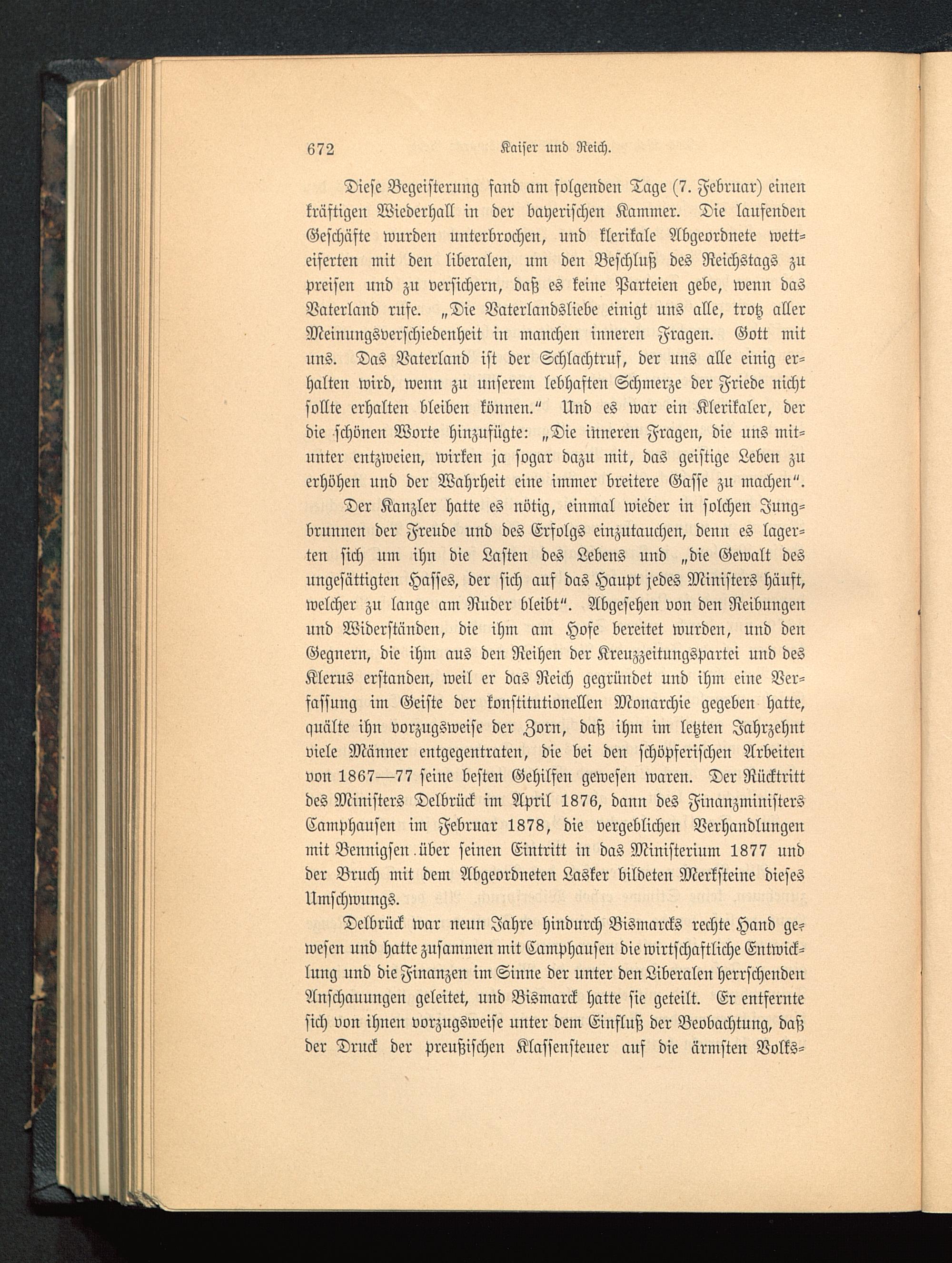 Der Kanzler hatte es nötig, einmal wieder in solchen Jung-brunnen der Freude und des Erfolgs einzutauchen, denn es lager-ten sich um ihn die Lasten des Lebens und „die Gewalt desungesättigten Hasses, der sich auf das Haupt jedes Ministers häuft,welcher zu lange am Ruder bleibt". Abgesehen von den Reibungenund Widerständen, die ihm am Hofe bereitet wurden, und denGegnern, die ihm aus den Reihen der Kreuzzeitungspartei und desKlerus erstanden, weil er das Reich gegründet und ihm eine Ver-fassung im Geiste der konstitutionellen Monarchie gegeben hatte,quälte ihn vorzugsweise der Zorn, daß ihm im letzten Jahrzehntviele Männer entgegentraten, die bei den schöpferischen Arbeitenvon 1867—77 seine besten Gehilfen gewesen waren. Der Rücktrittdes Ministers Delbrück im April 1876, dann des FinanzministersCamphausen im Februar 1878, die vergeblichen Verhandlungenmit Bennigsen, über seinen Eintritt in das Ministerium 1877 undder Bruch mit dem Abgeordneten Lasker bildeten Merksteine diesesUmschwungs.